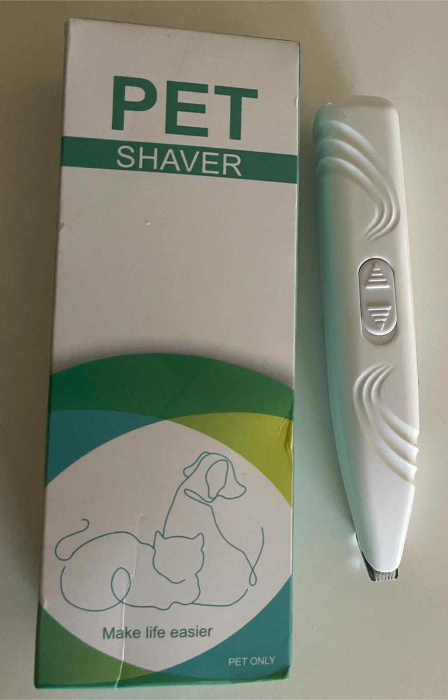 I'm selling a MIAOQUANJI pet shaver. It comes with the box and is in great condition! It is white in color and requires AAA*2 batteries. This pet shaver is perfect for keeping your furry friends looking their best
