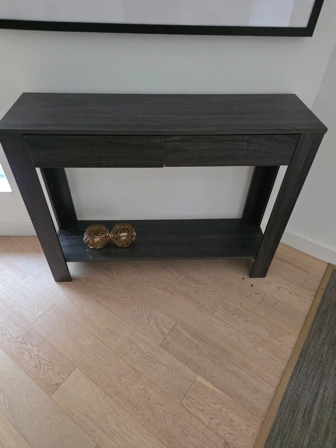 Selling a dark grey console table. It features two drawers and a lower shelf for extra storage or display. It's in great condition and would look lovely in an entryway or living room