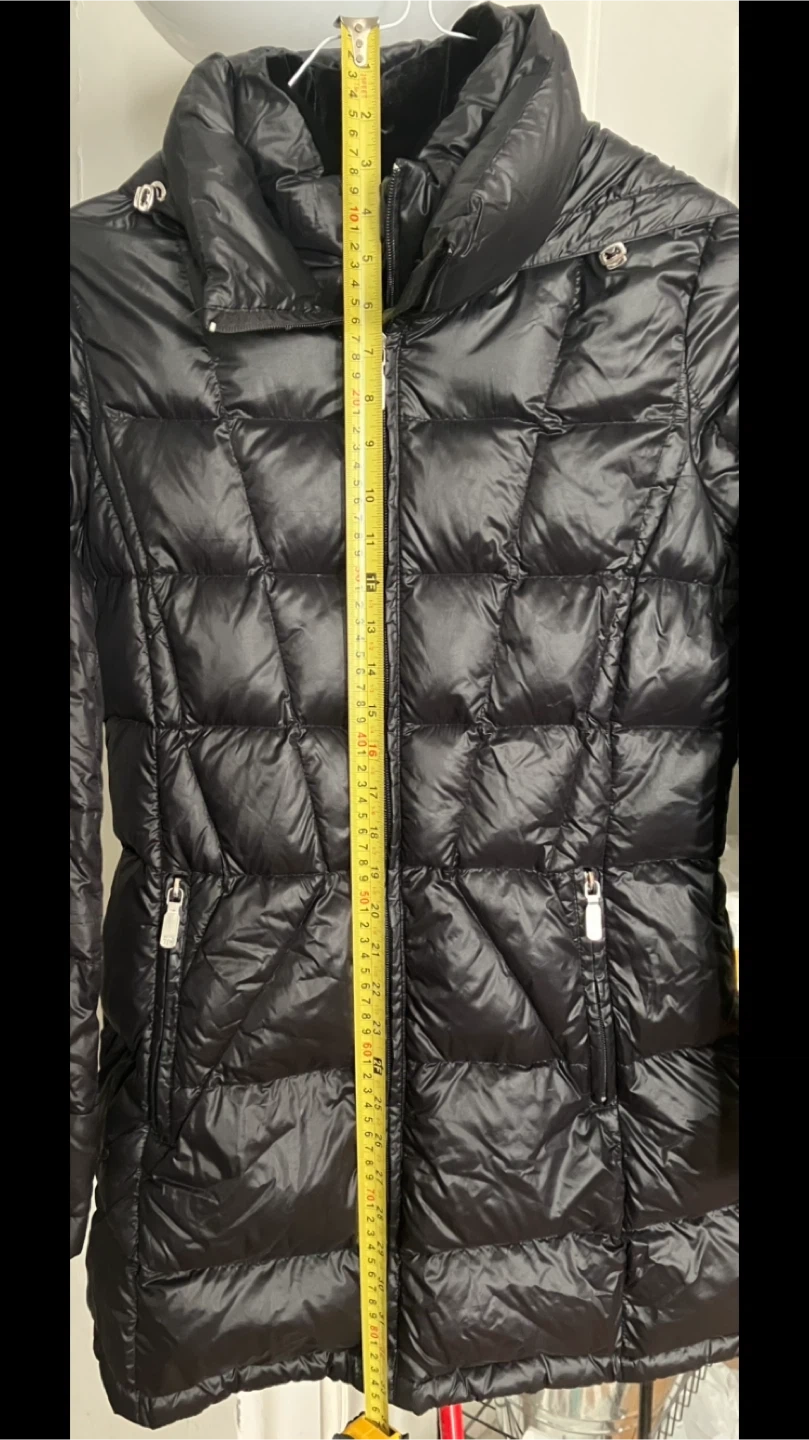 Nice slim, elegant fit, and soft, very comfy, so chic, with a hood. Zipper side pockets. Features a stylish design and a comfortable fit. Slimming and lengthening look. Has double zippers on front. 🌟THIS IS a Medium but it has a slim fit. It’s not a big or heavy coat. Measurements are shown in photos^, the waist is 14” inches long measured flat across, and the length of coat from top to bottom is approximately33” inches long, this coat will only fit someone who is slim, so please keep this in mind. 🌟