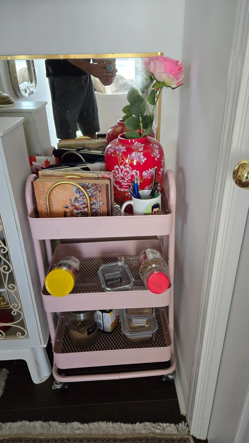Selling a handy rolling cart! It's in great shape and perfect for adding some extra storage to any room. The pink colour is super cute and would look great in a kitchen, bathroom, or craft room