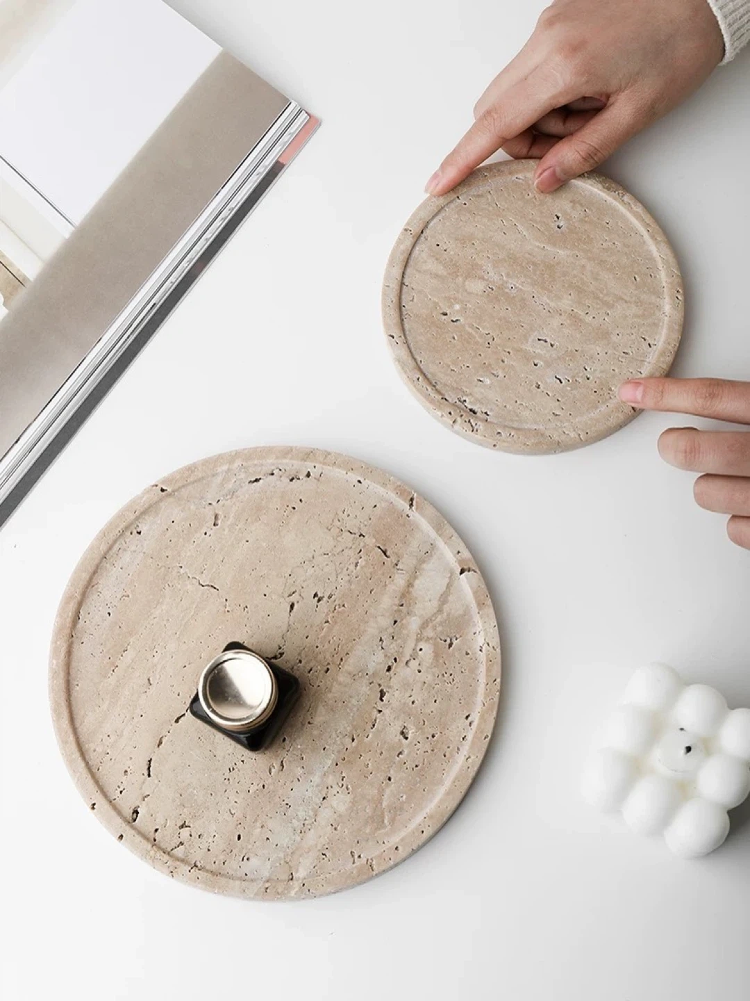 I'm selling these lovely travertine stone trays! They're perfect for adding a touch of natural elegance to your home decor. Use them to display candles, jewelry, or even as a stylish soap dish. The unique patterns in the stone make each tray one-of-a-kind