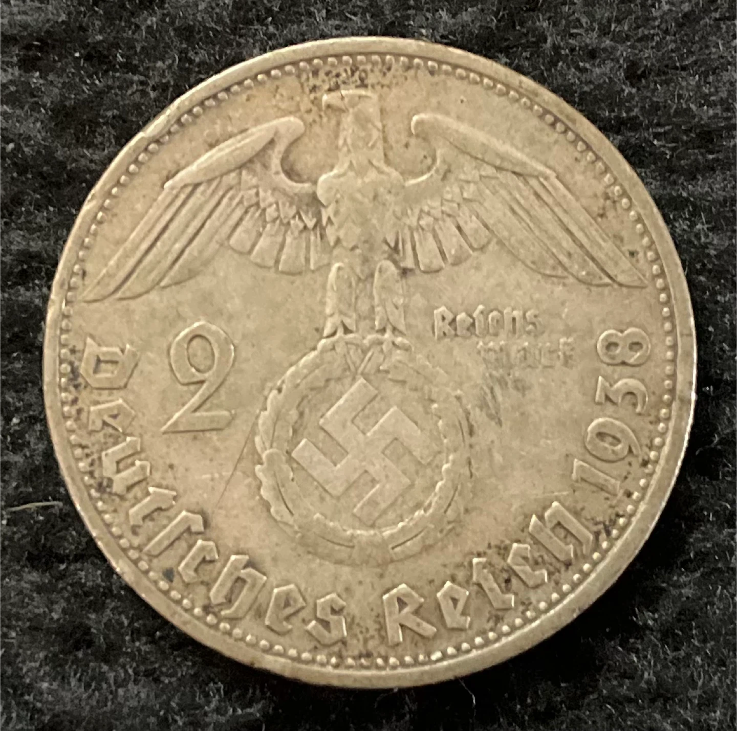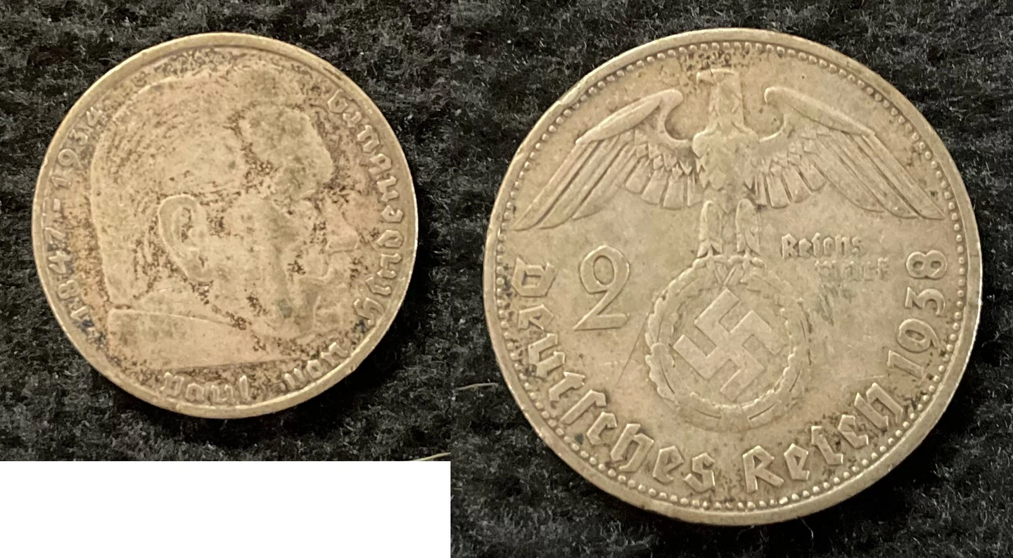 Selling a 1938 Two Reichsmark coin from Germany. 62.5% silver. The reverse of a portrait of Paul Von Hindenburg is fading, but the obverse of the eagle and swastika is good.