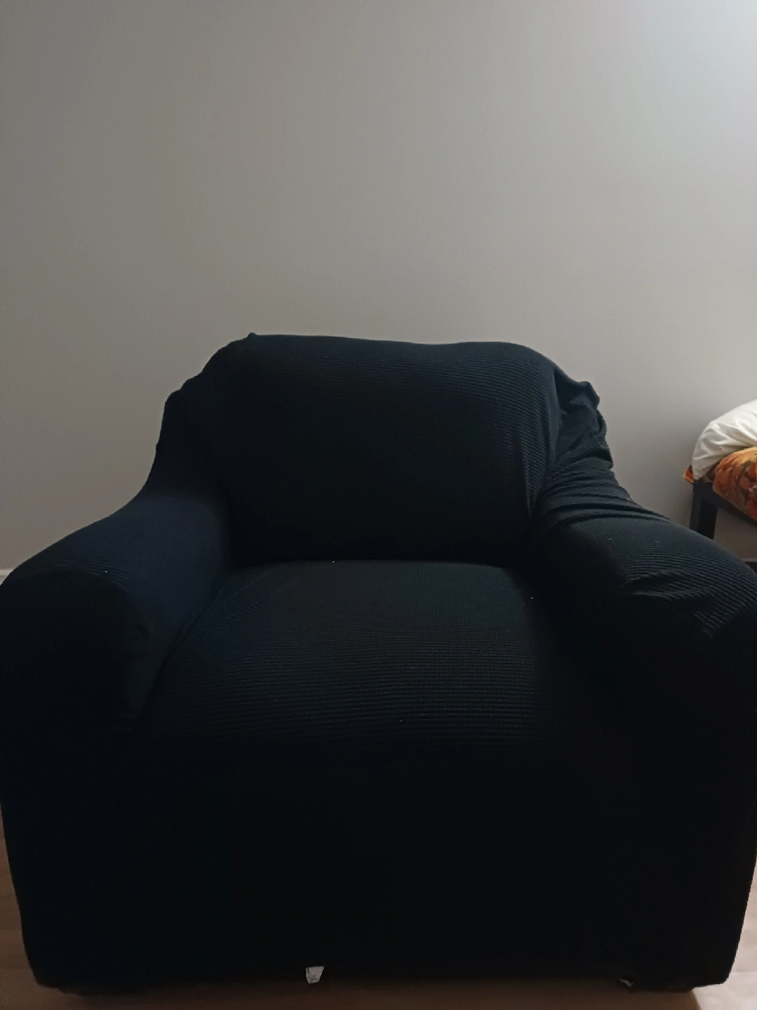Selling a black armchair. It's showing some wear and tear on the seat, as you can see in the pictures. It's still comfy and has lots of life left! I've also included a black cover for it.