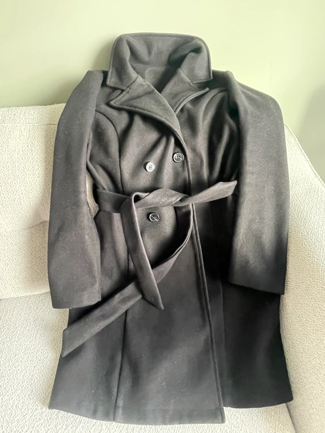 Selling a stylish black wool coat with a belted waist. It's in great condition and perfect for the cold temperatures!