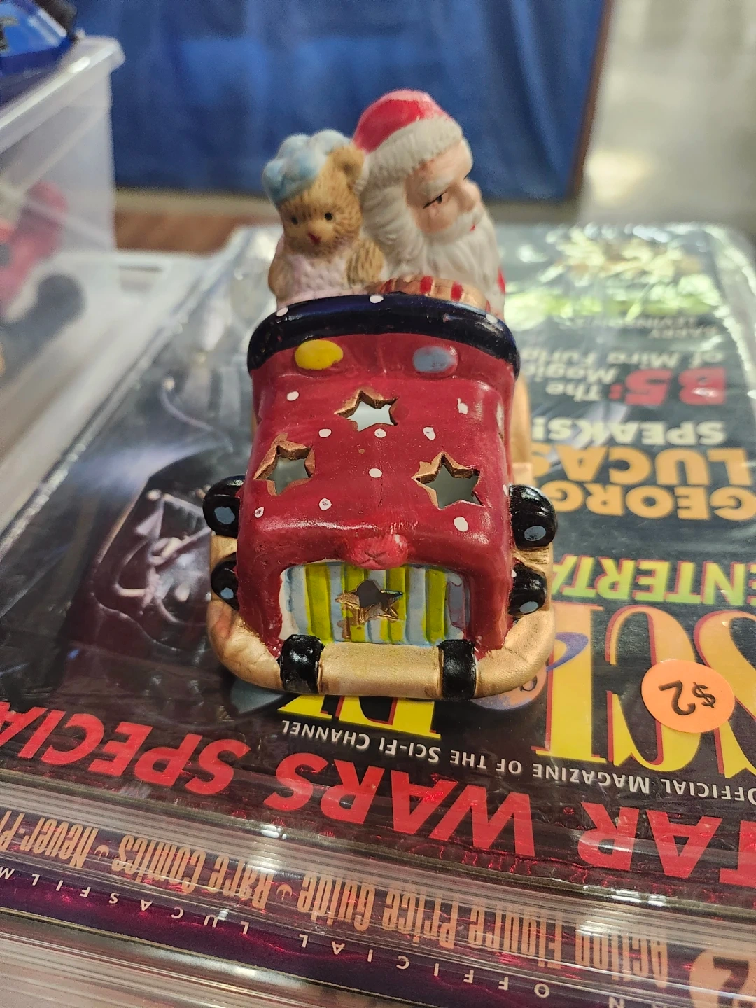 A charming Santa and bear figurine in a sleigh, perfect for holiday decor! It features a red and white Santa with a blue-hatted bear, riding in a colourful sleigh with star cutouts. This unique piece would make a lovely addition to any collection or festive display