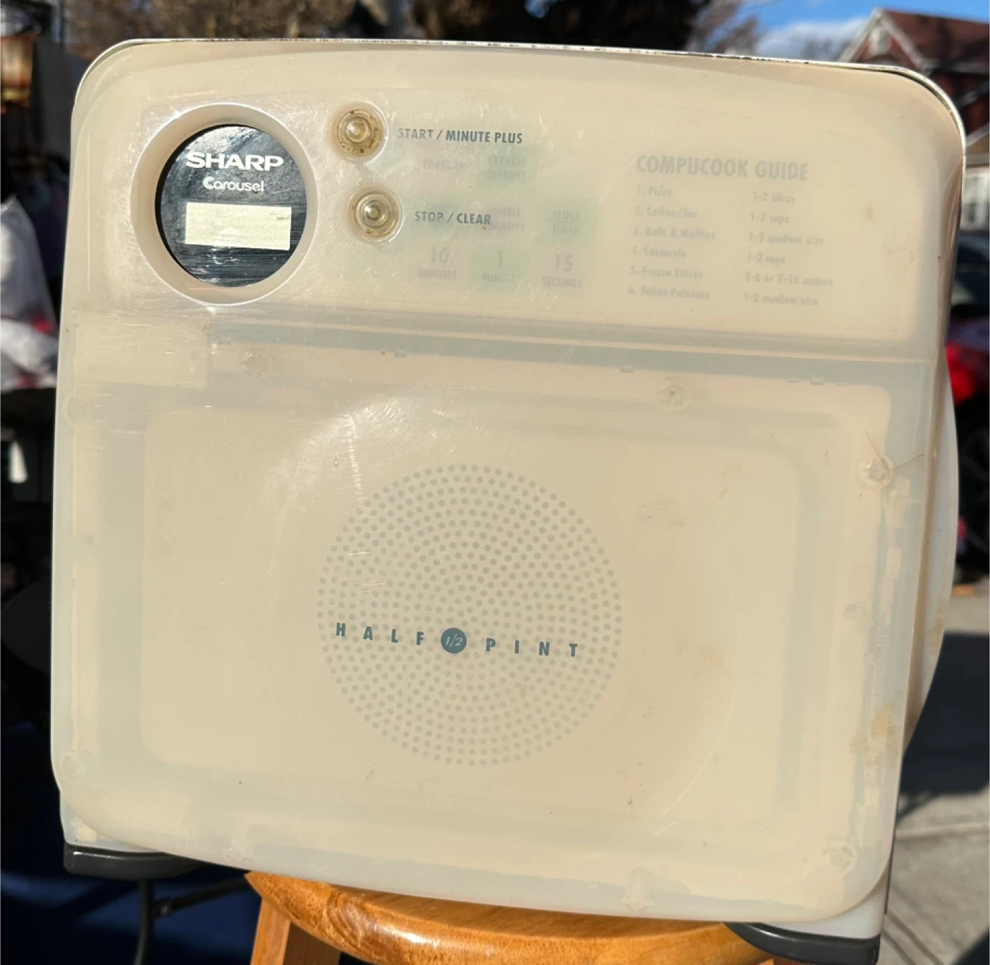 Selling a Sharp Carousel microwave. It features a compucook guide with settings for pizza, coffee/tea, rolls & muffins, casserole, frozen entree, and baked potatoes. It has settings for popcorn, express defrost, and a clock timer. The microwave has a carousel inside.