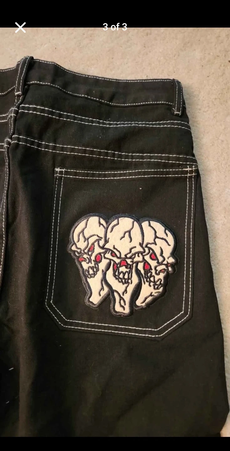 Selling a pair of black jeans featuring a unique skull design on the back pocket. The jeans have a classic fit and are perfect for adding a bit of edge to your wardrobe