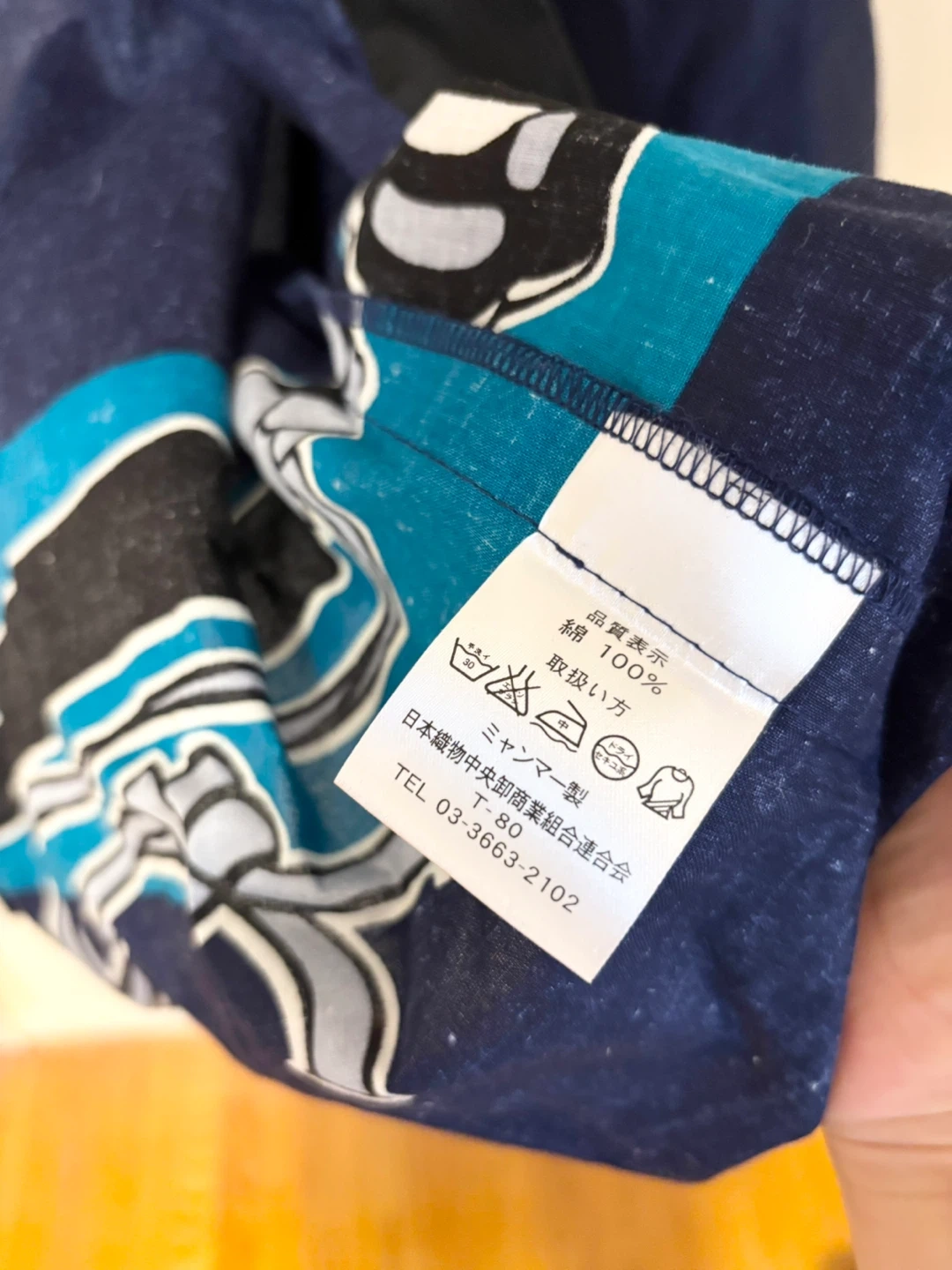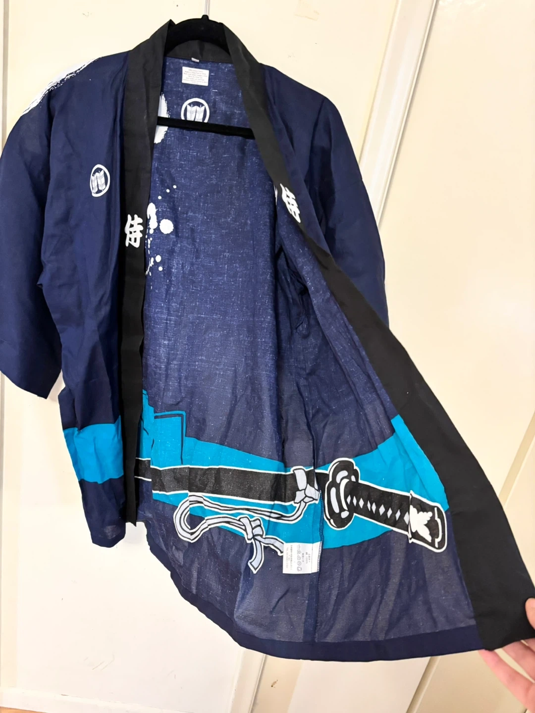 Here's a cool Japanese style kimono. It is made of 100% cotton. It features a unique design with Japanese characters and symbols on a navy blue and turquoise background. It's in great shape and ready for a new home!