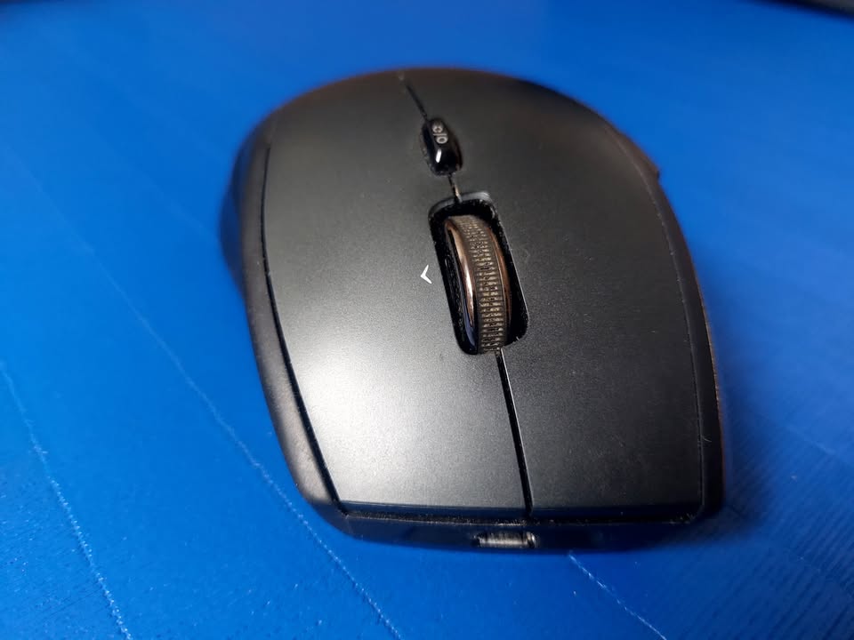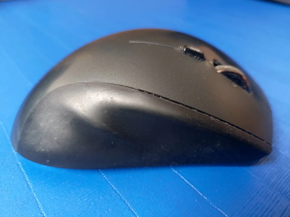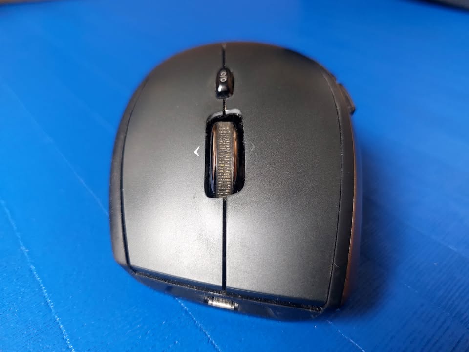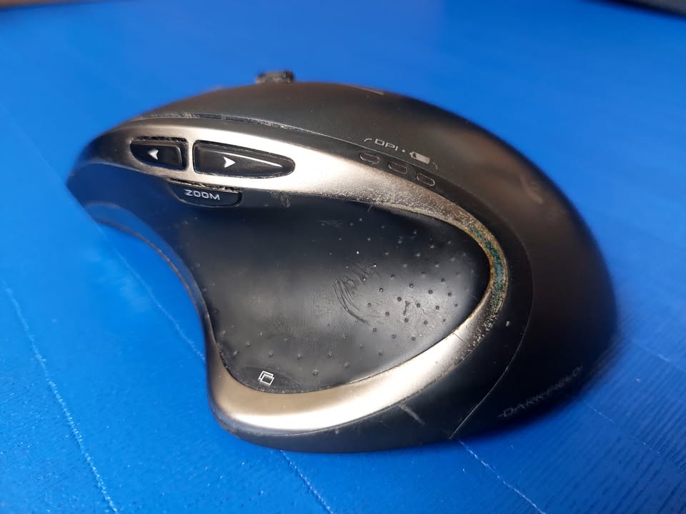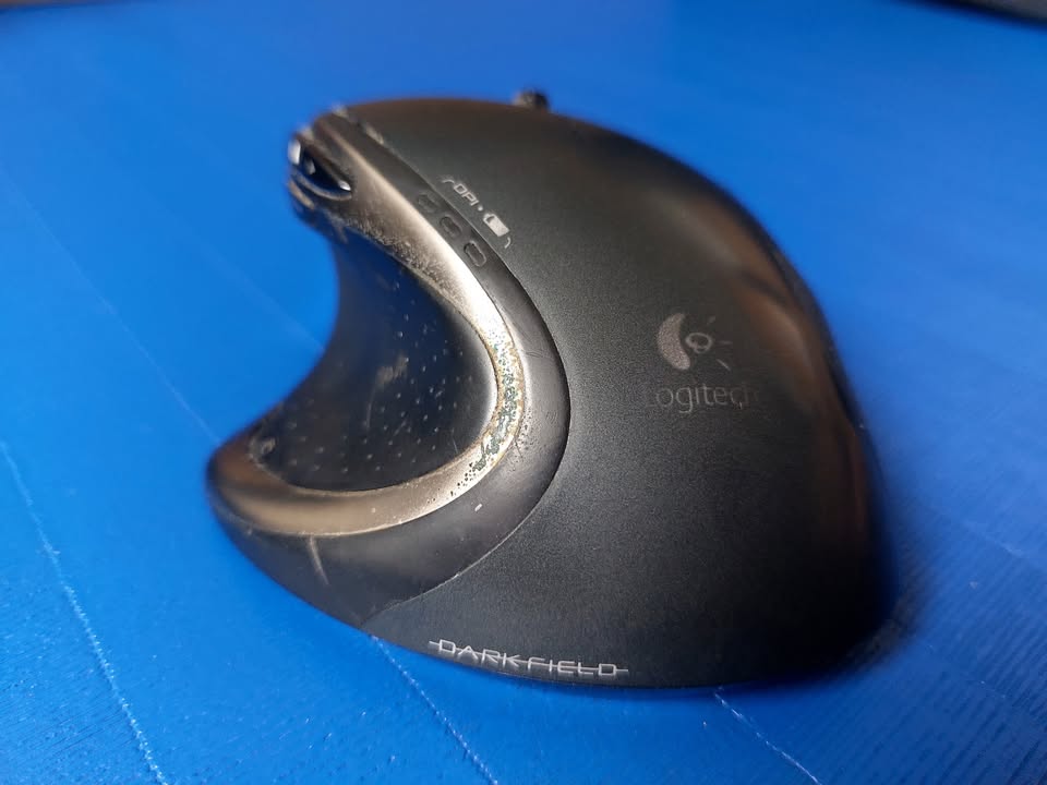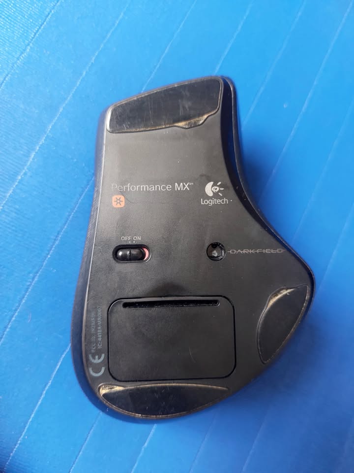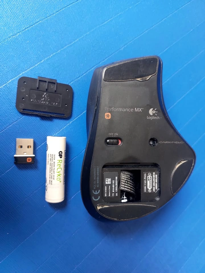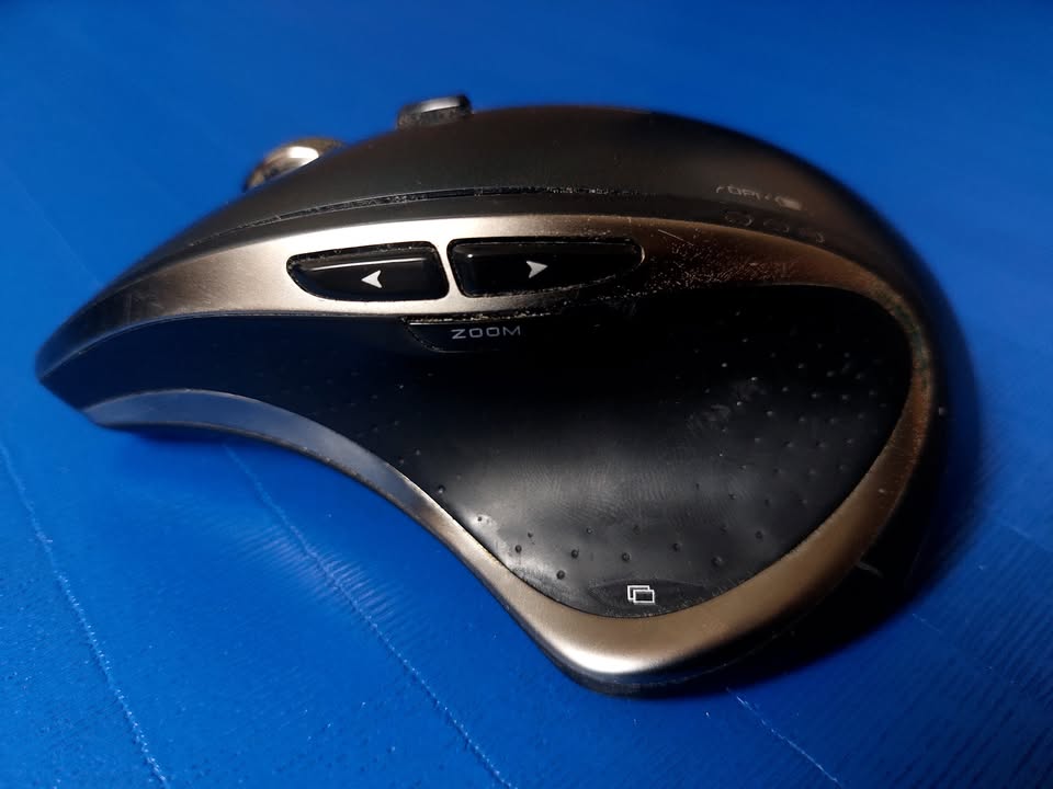 Logitech Performance MX wireless mouse, with 8 buttons and smooth scroll toggle. Includes Logitech Unifying Receiver and rechargeable NiMH AA battery. It’s a nice ergonomic mouse, and still works well, although it is visibly worn after years of use.