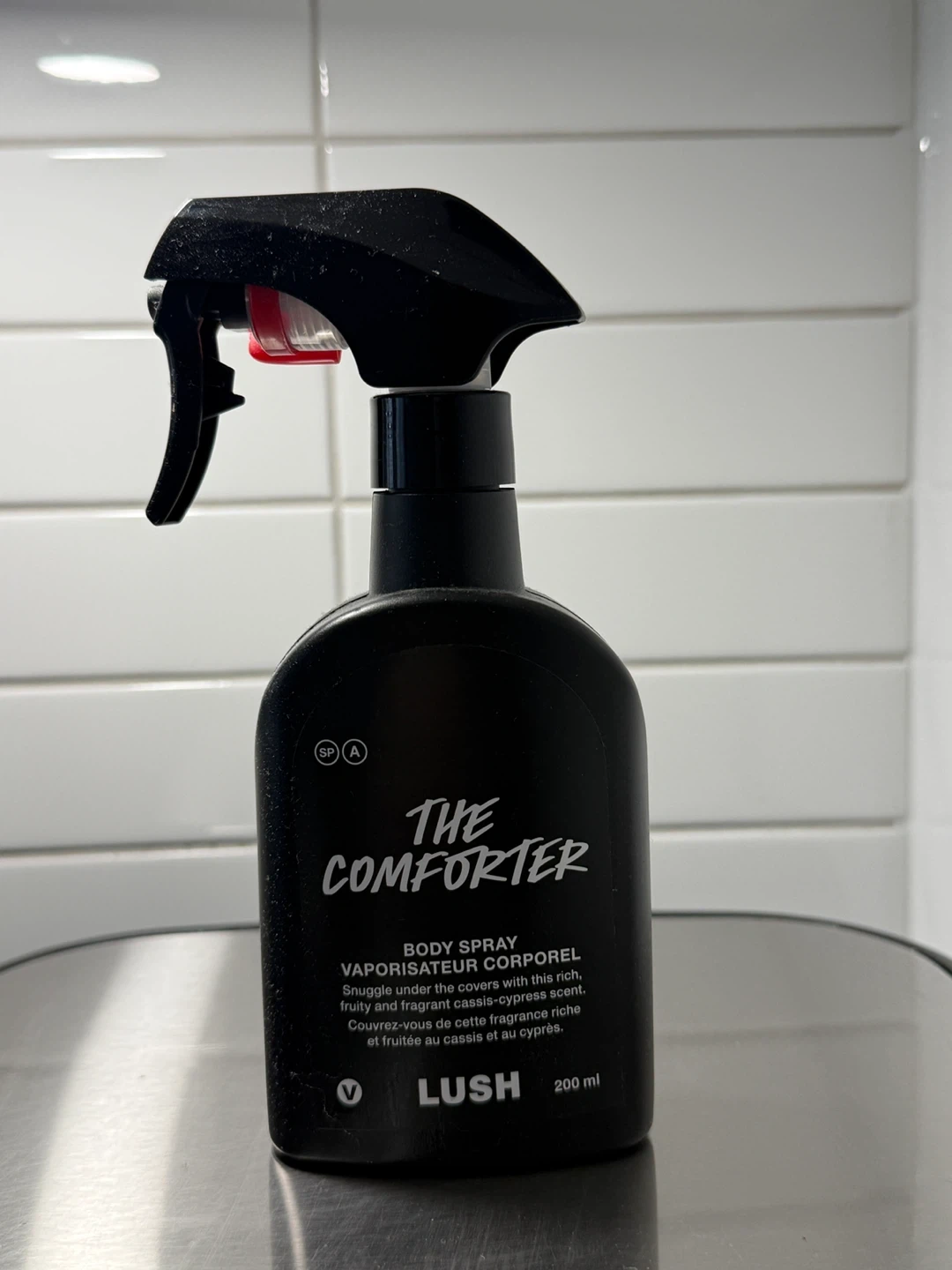 Selling a Lush 'The Comforter' body spray. It's a 200ml bottle. The scent is described as a snuggle under the covers with a rich, fruity blackcurrant and cypress scent. Spritz all over your body for a gentle and soft feel! Used one time