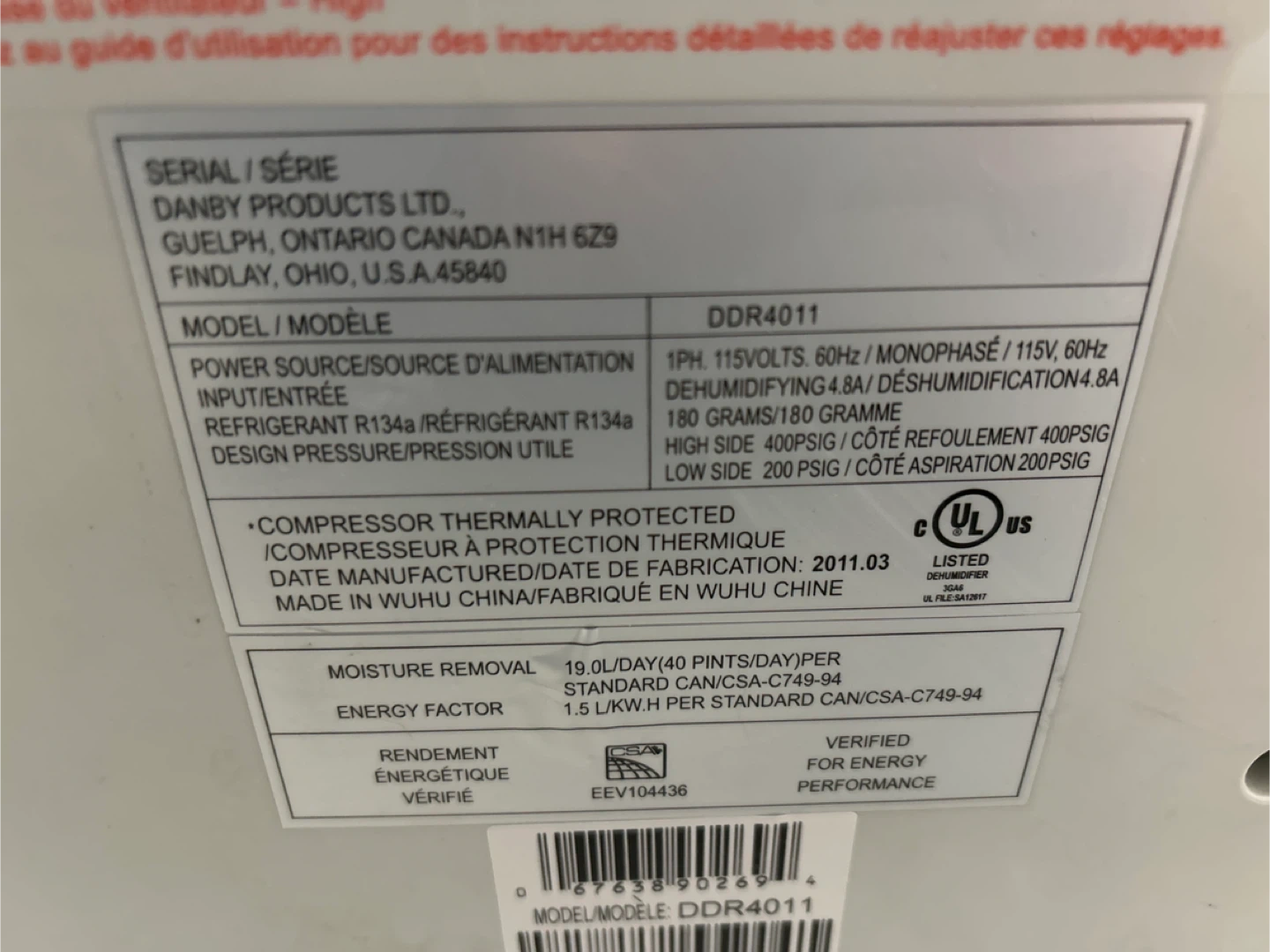 Selling a Danby DDR4011 dehumidifier. It's in good working condition and ready to help keep your place dry and comfortable. The date manufactured is 2011 March 03. It removes 19.0L of moisture per day.