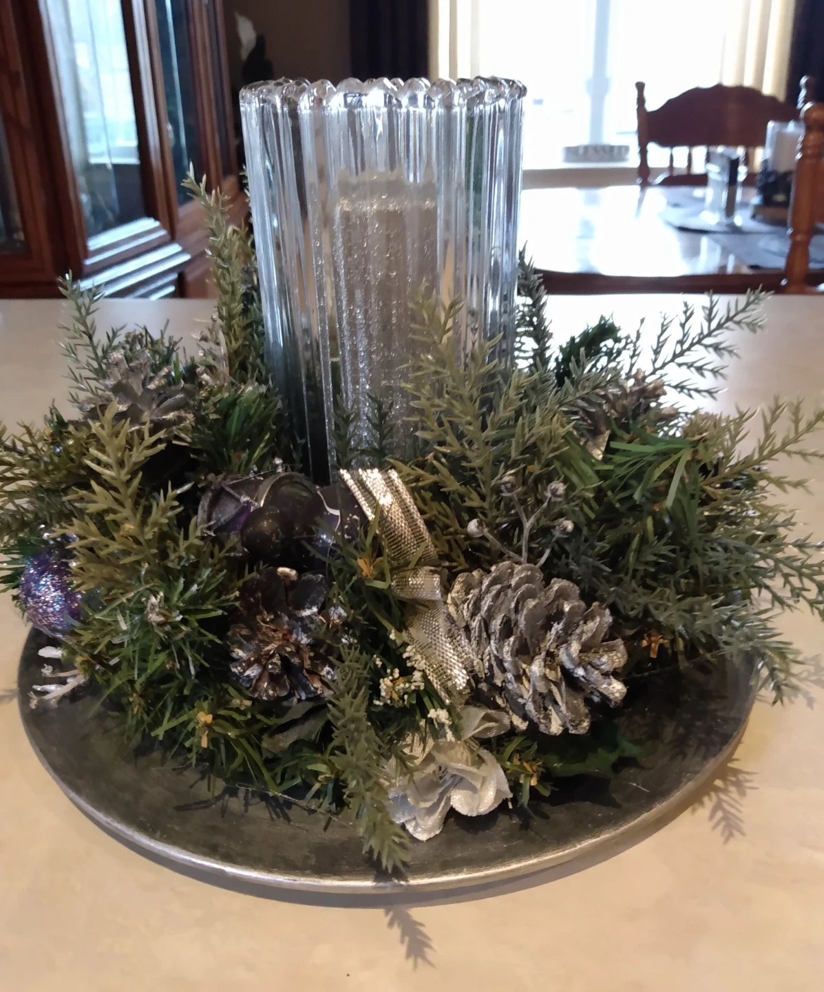 Selling a Christmas candle centerpiece that would look great on any table! It features a clear glass candle holder surrounded by festive greenery, pinecones, and silver accents plate. . Perfect for adding a touch of holiday cheer to your home. Cash pick up