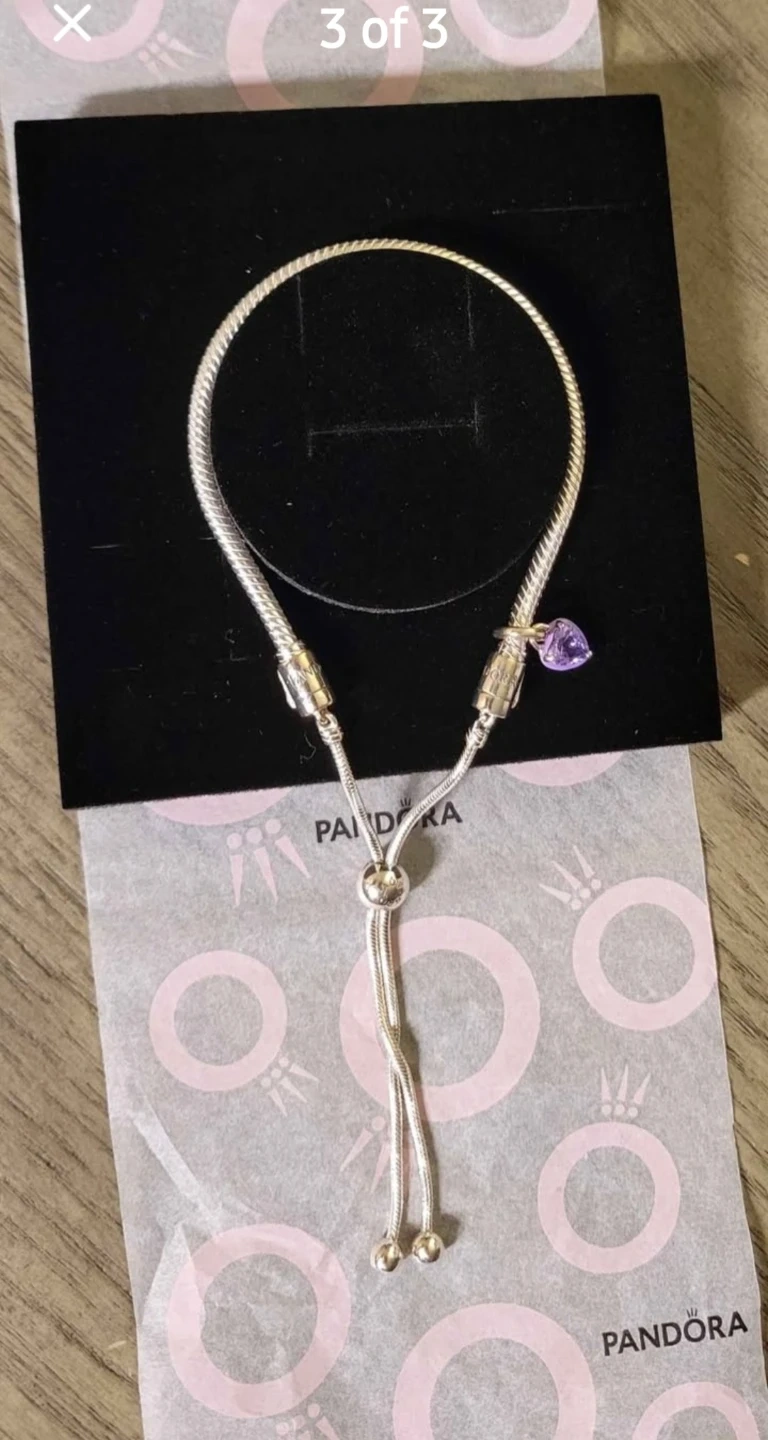 Sterling Silver Pandora Moments Snake Chain Slider Bracelet with a purple heart charm. New in box. Pick up near Fanshawe and Highbury.