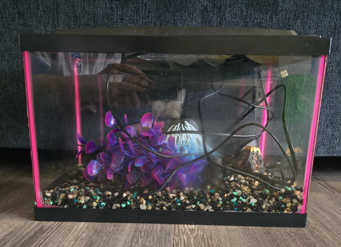 Selling a gently used 5 gallon fish tank with gravel, heater, filter, bubbler and decorations. Everything you need to start and perfect for a small fish or a beginner!
