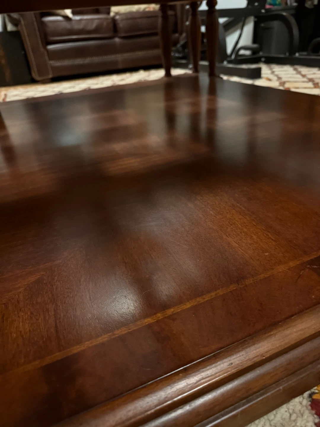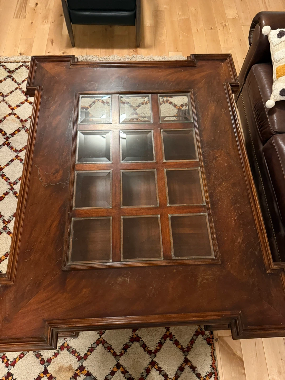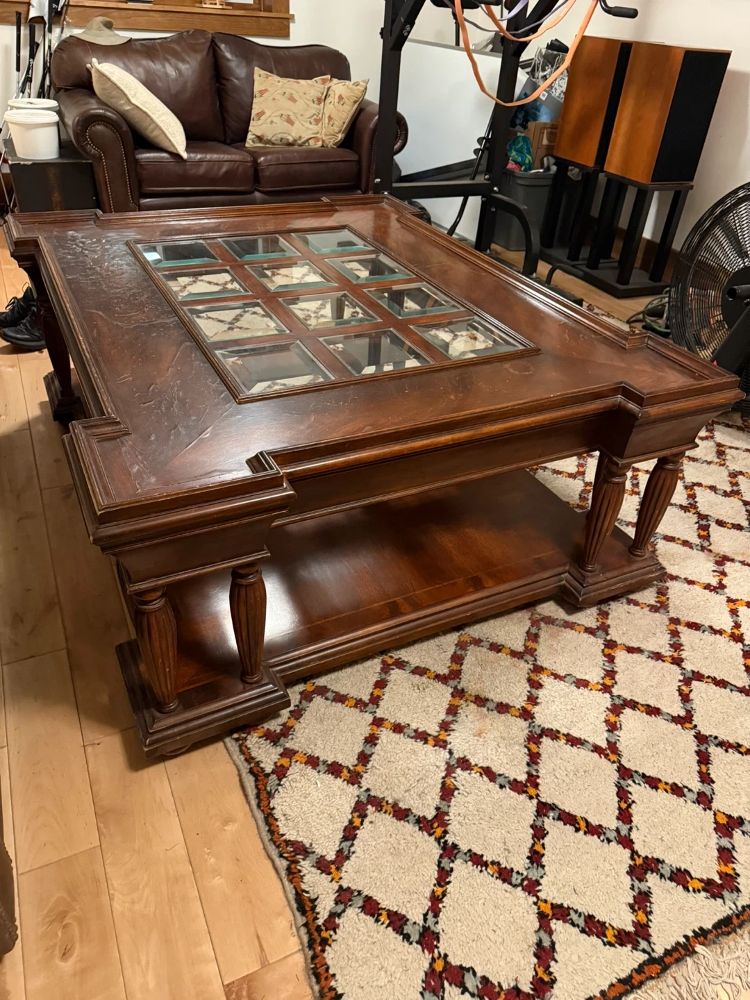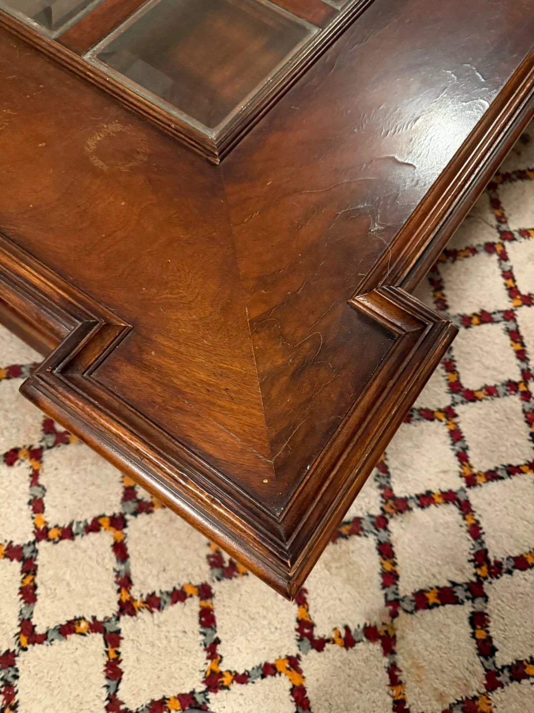 10Massive dark wood coffee table fit for a king. Originally purchased for $2500. It has a traditional Georgian style with, glass inserts, carved legs and a lower shelf for storage. There are some signs of wear, but overall it's in good condition and would be a nice addition to any large living room or lounge.
