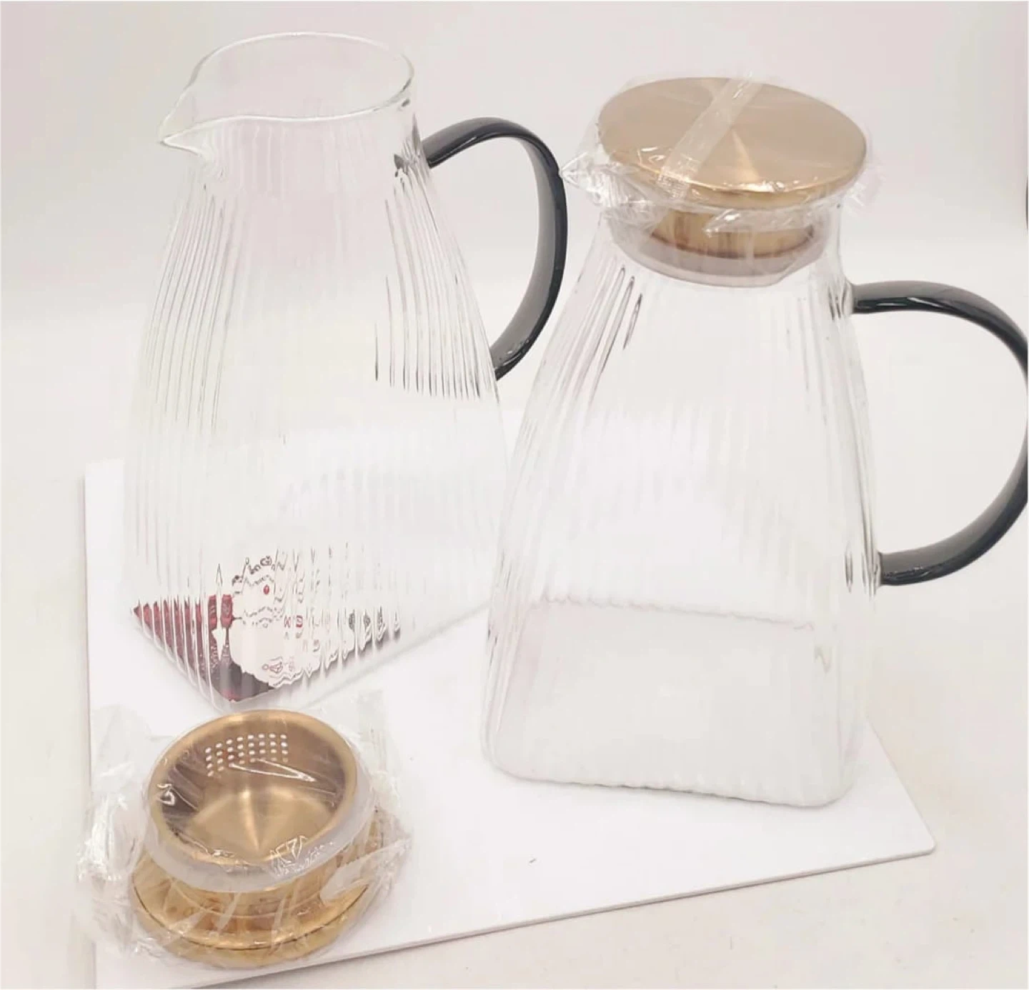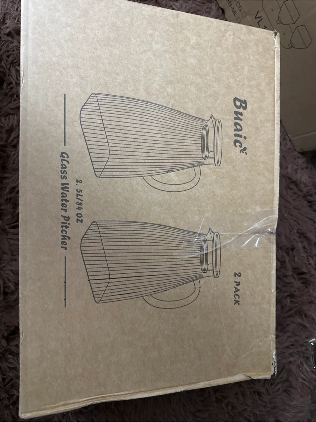 Selling a set of two Buaic glass water pitchers. They're in new condition and come with the original box. Each pitcher has a 2.5L / 84 oz capacity and features a stylish, ribbed design. Perfect for serving water, juice, or other beverages!
