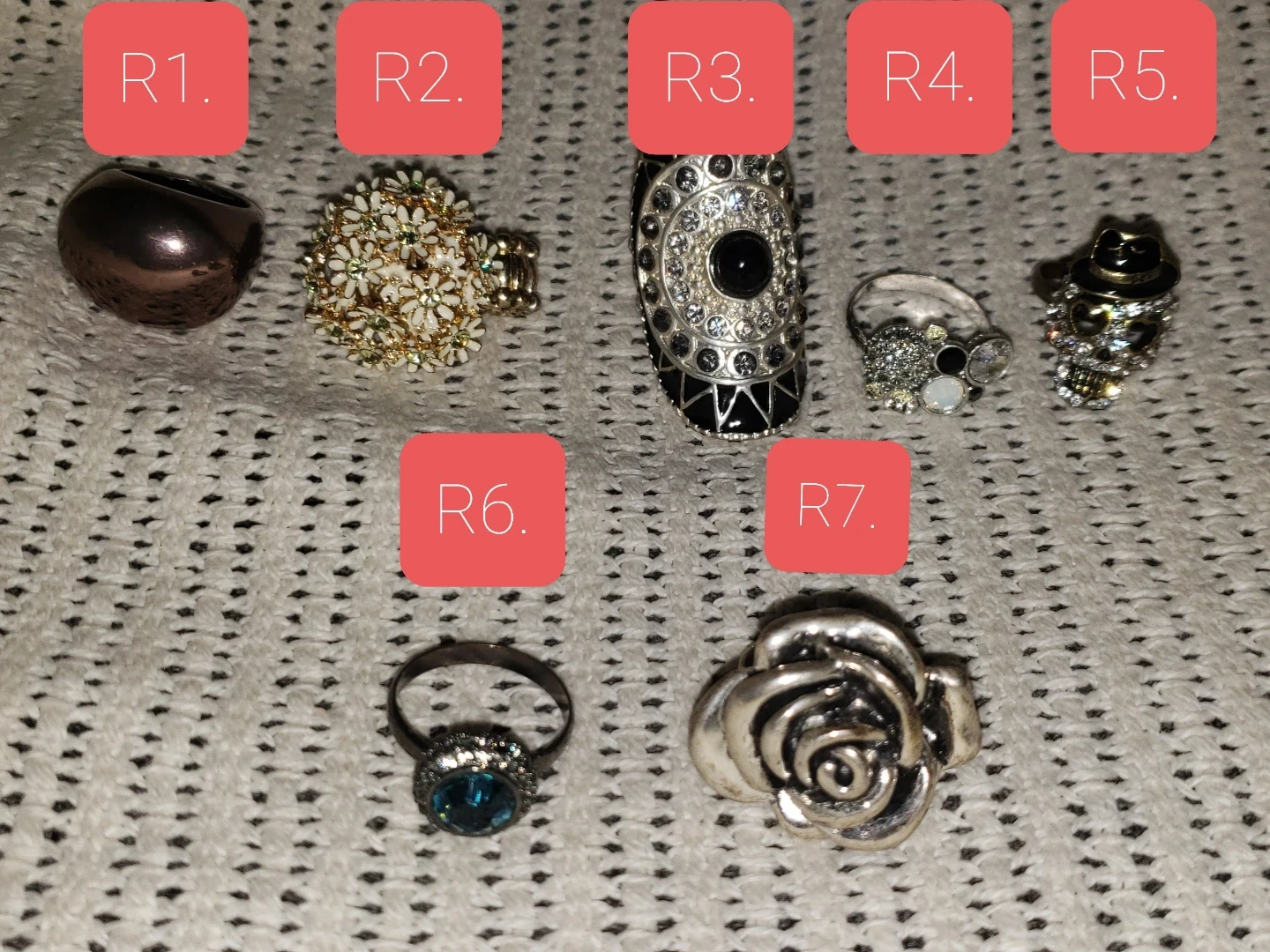 Assorted rings, bracelets and necklaces available. May be purchased as a lot (for listing price), a deal (see pricing guide below) or you may pick individual pieces (see pricing guide below).