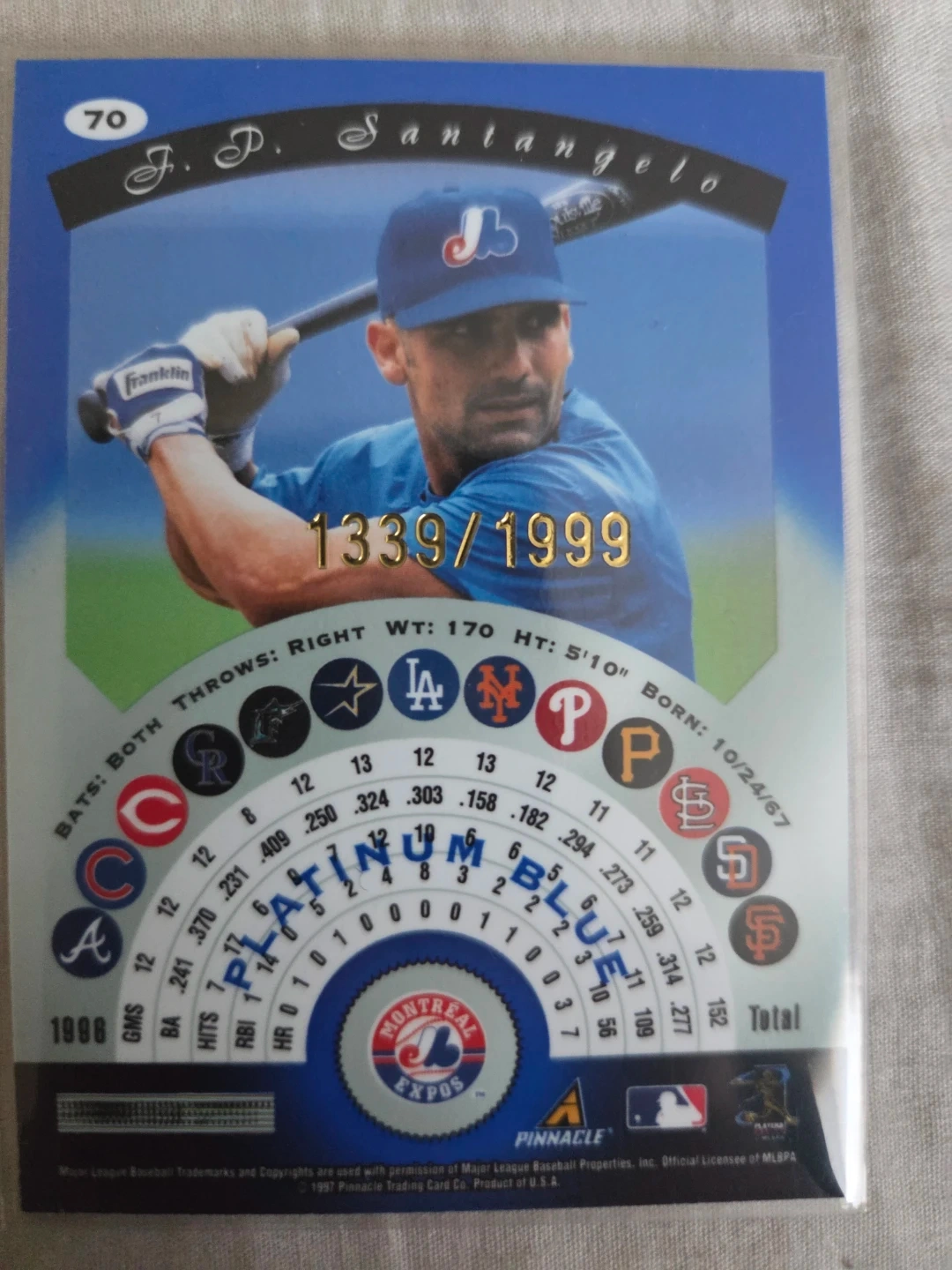 Selling a J.P. Santangelo baseball card. This card is from the 1998 Platinum Blue series and is numbered 1339/1999. A great addition to any baseball card collection!