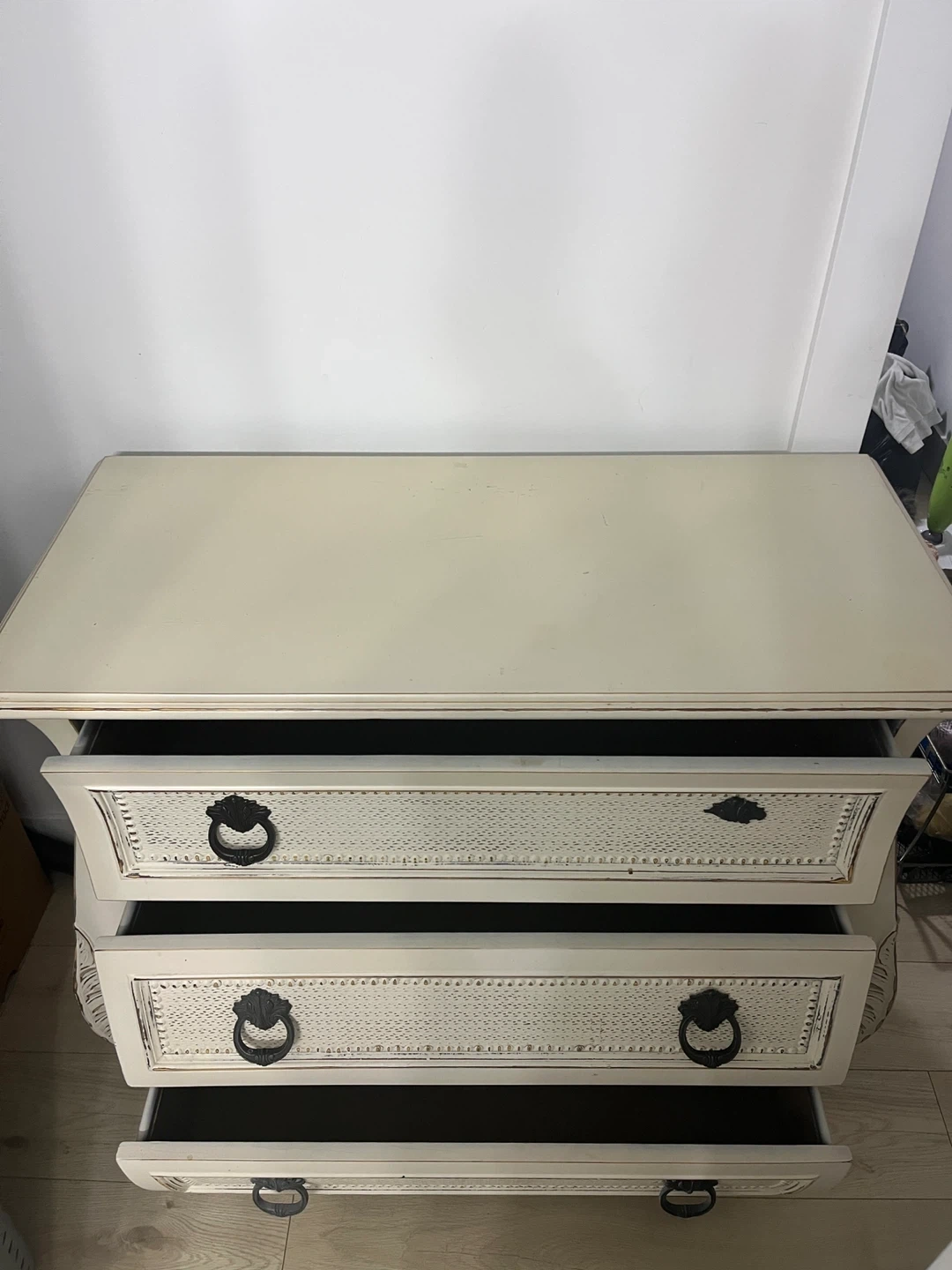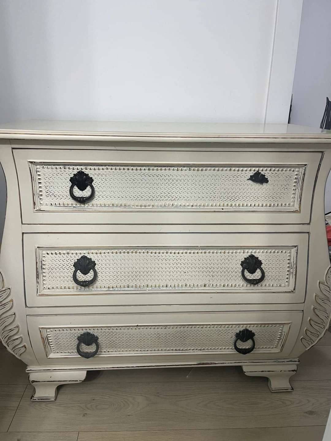 Selling a charming white 3-drawer dresser! It's perfect for adding a touch of elegance to any room. The dresser features ornate detailing and classic hardware, giving it a unique and stylish look. The drawers offer ample storage space for your clothes and belongings. It's in great condition and ready for a new home