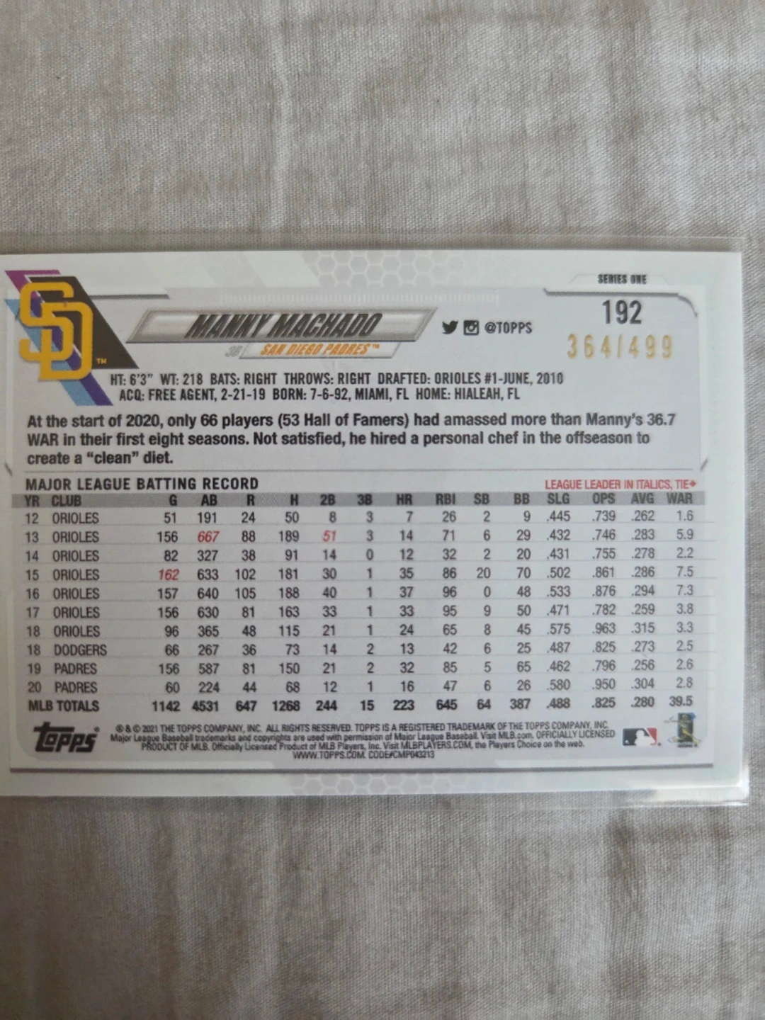 Selling a Manny Machado baseball card from Topps. It's in great condition and would be a fantastic addition to any baseball card collection!