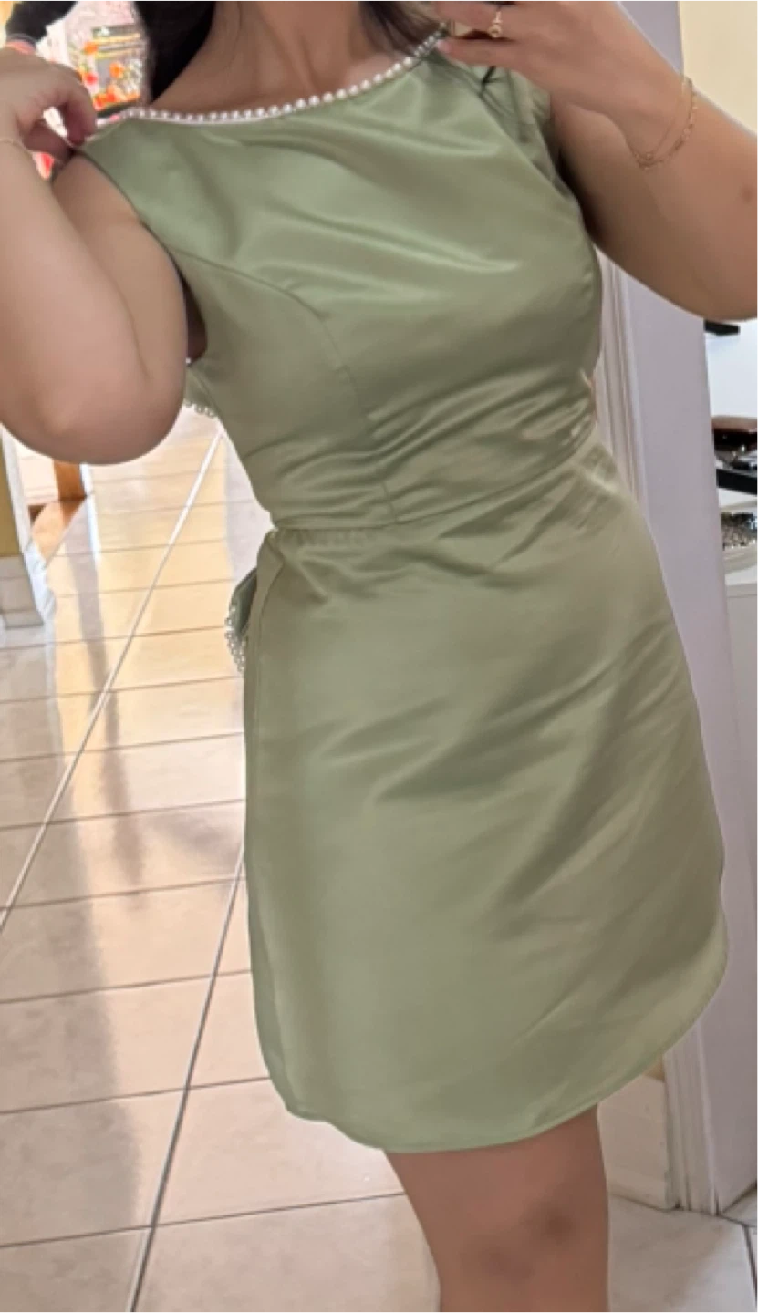 Selling a lovely green dress! It features pearl detailing around the neckline and back. The dress also has a stylish bow at the back. It's perfect for a special occasion or a night out
