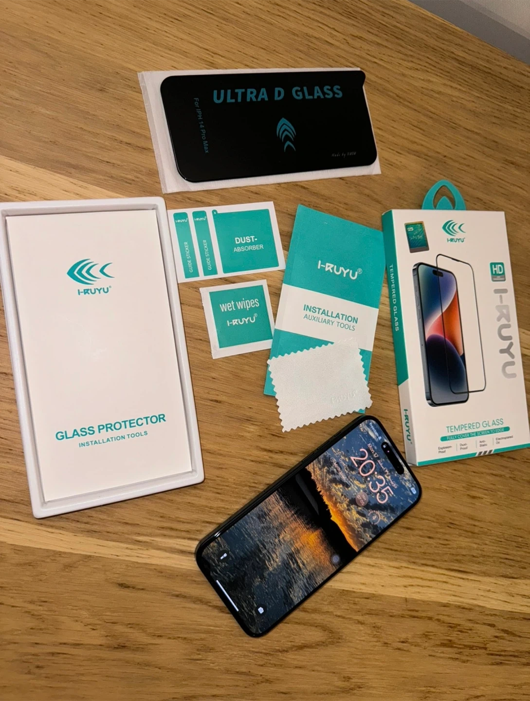 Selling a brand new I-RUYU tempered glass screen protector. It's designed to fully cover the screen edge to edge and features HD high transparency. The package includes installation tools, dust absorber, and wet wipes to ensure a perfect application. Keep your phone screen protected with this easy-to-install glass protector!