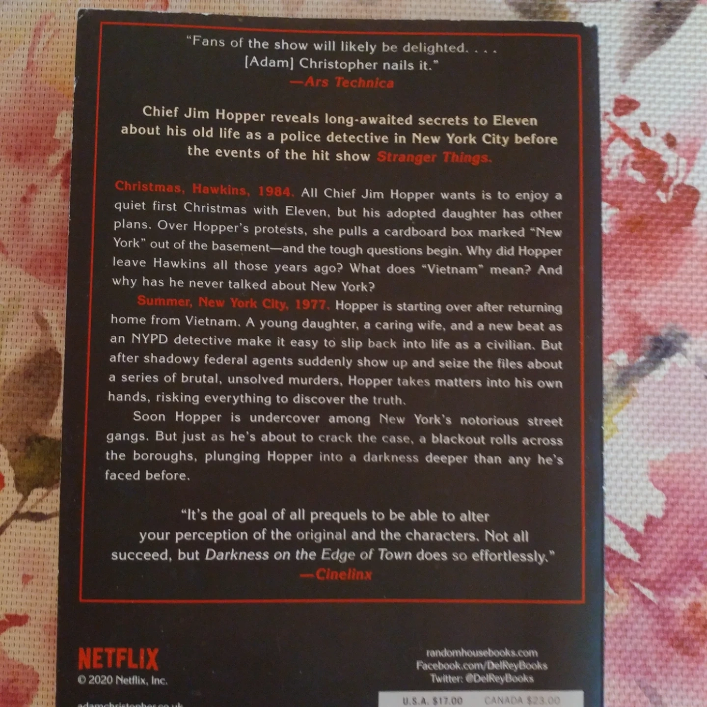 Selling a copy of 'Stranger Things: Darkness on the Edge of Town' by Adam Christopher. It's an official Stranger Things novel that delves into Chief Jim Hopper's past as a police detective in New York City. A great read for fans of the show!