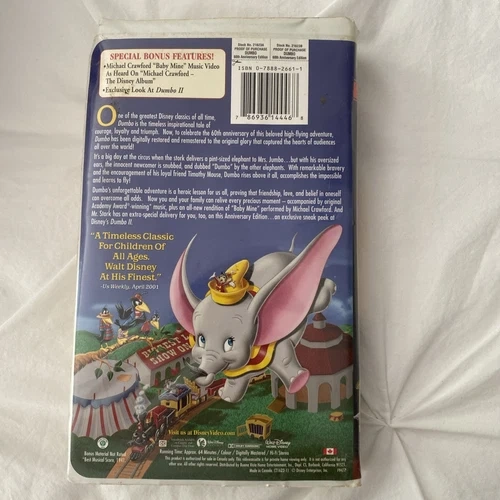Experience the magic of Disney's beloved classic with the Dumbo 60th Anniversary Edition VHS. This cherished film, released in 2001, brings the enchanting story of the little elephant with big ears to your home video collection. Ideal for Disney enthusiasts and collectors, this edition celebrates the timeless appeal of one of animation's most charming tales.