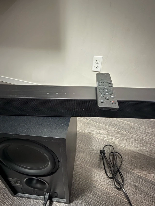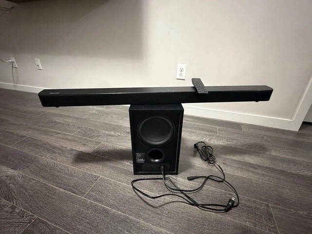 Experience immersive audio with this mint condition Hisense soundbar, delivering rich sound and deep bass to elevate your home entertainment. This soundbar comes with a wireless subwoofer.