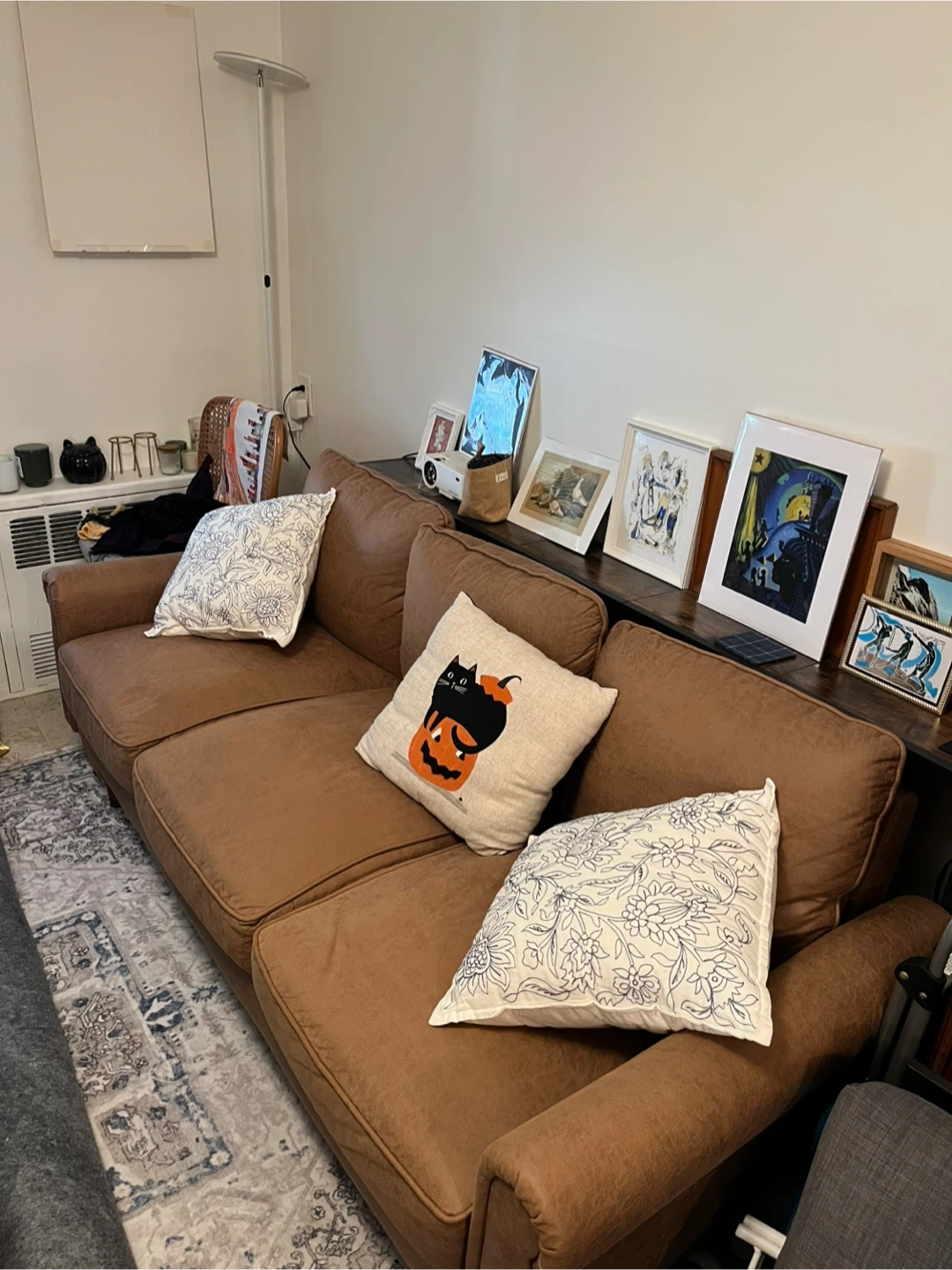 Selling a gently used Wayfair brown suede sofa. It's in great condition and would be a cozy addition to any living room! The leather has a nice, warm tone that complements a variety of decor styles. Perfect for lounging and relaxing after a long day