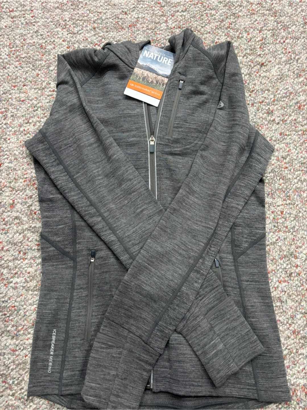 Icebreaker Women's Quantum Long Sleeve Zip Hood in size medium. This hoodie is made with Merino wool, which keeps you warm in the cold and cool in the heat. It's designed to provide ultimate comfort and fit, plus it breathes to prevent overheating. The material is non-itch and naturally odor resistant, and it's machine washable and dries fast