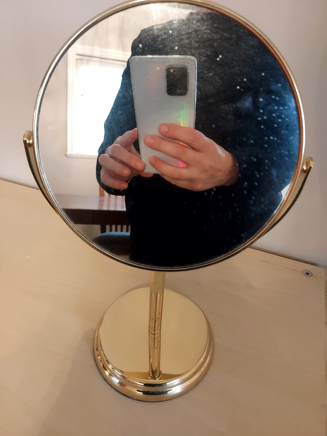 Selling a gold-tone vanity mirror. It's in great shape and would look lovely on any dresser or vanity! The mirror is round and sits on a sturdy base. Perfect for getting ready in style