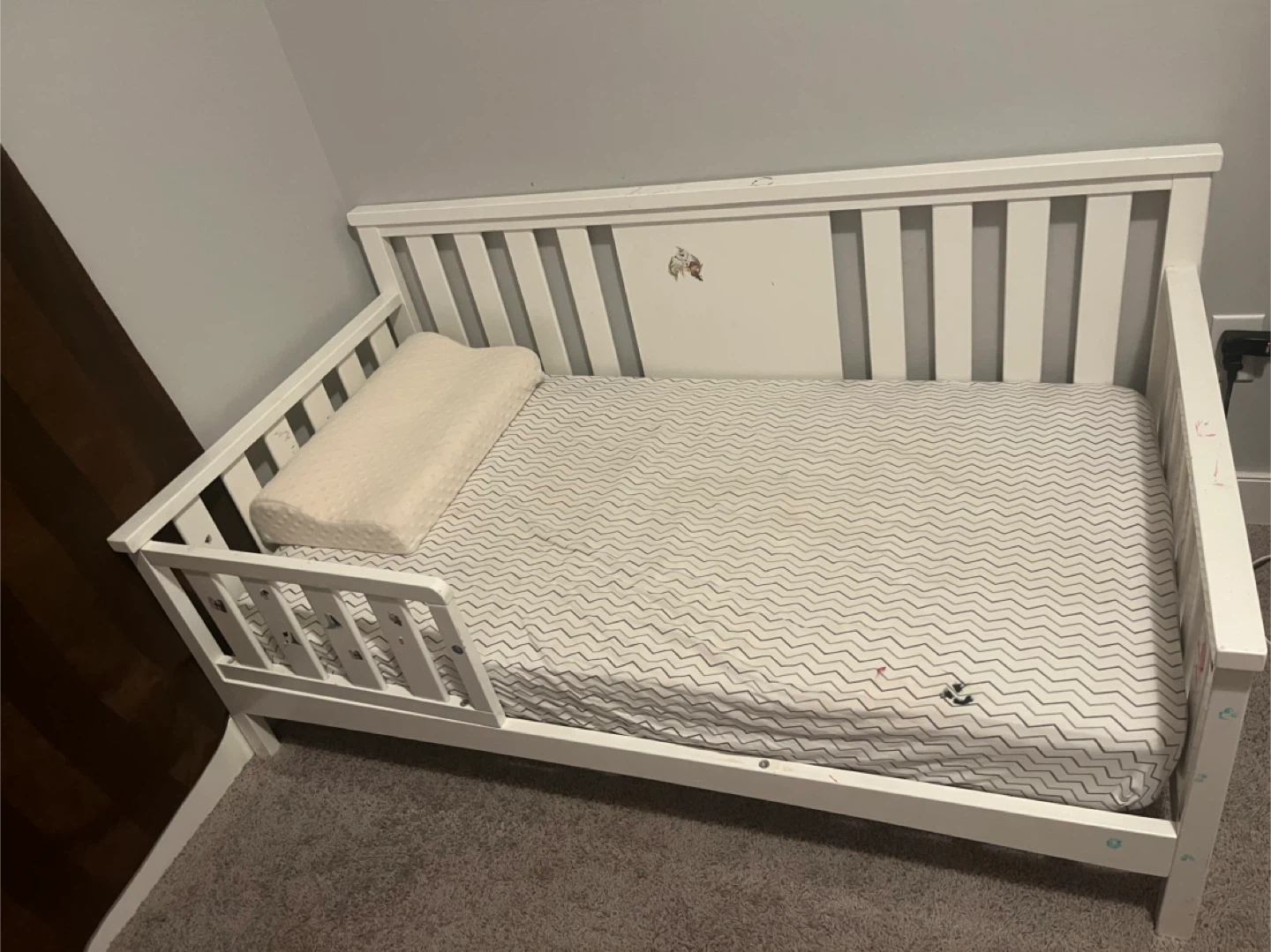 Selling a white toddler bed. It's in good condition and ready for a new home. Perfect for transitioning your little one from a crib! There are some minor marks on the bed.