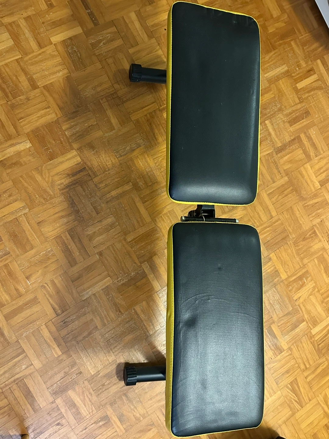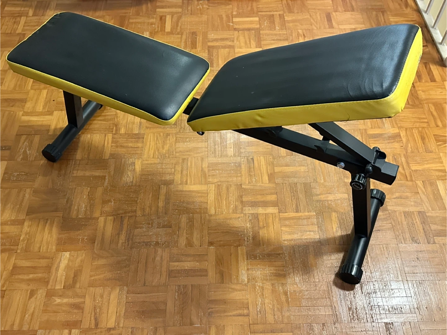 Selling an adjustable weight bench in black and yellow. It's in great condition and perfect for home workouts! It allows for various incline and decline positions to target different muscle groups. A great addition to any home gym setup!