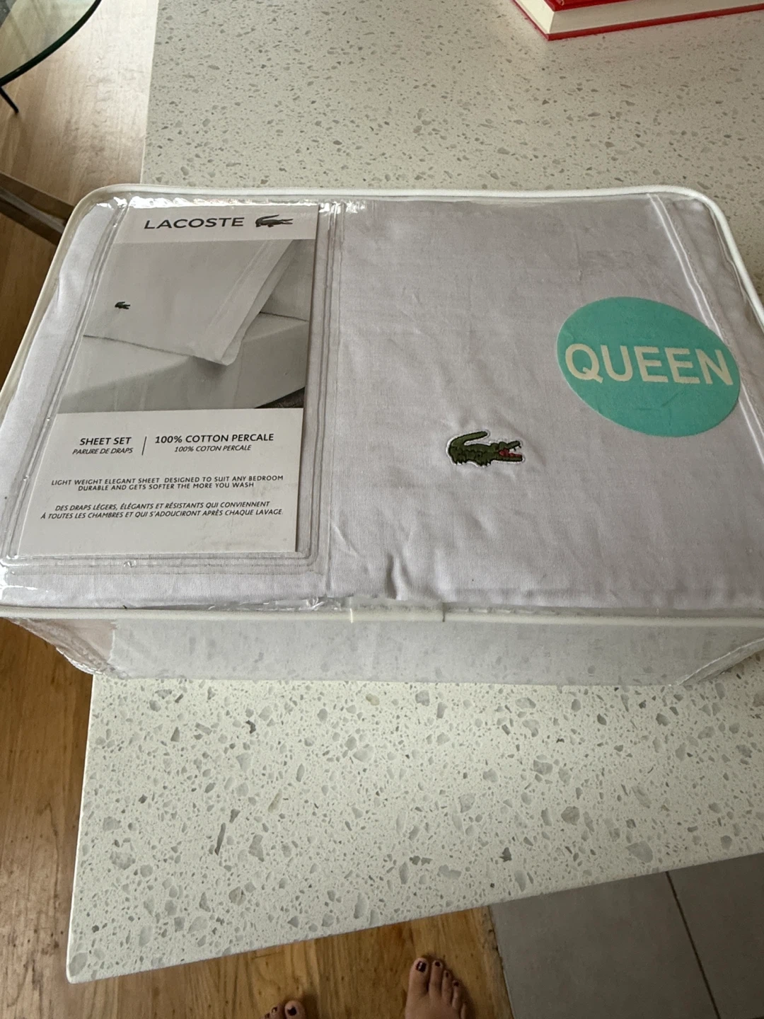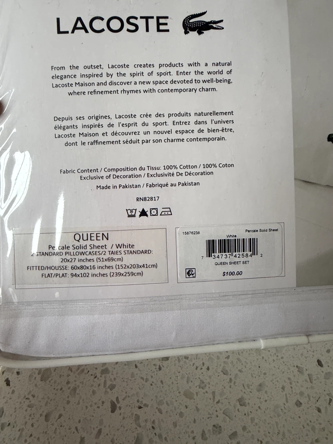 Selling a brand new Lacoste Queen size sheet set in white! The set includes 2 standard pillowcases, a fitted/house sheet, and a flat sheet. It's made of 100% cotton percale and originally retailed for $100