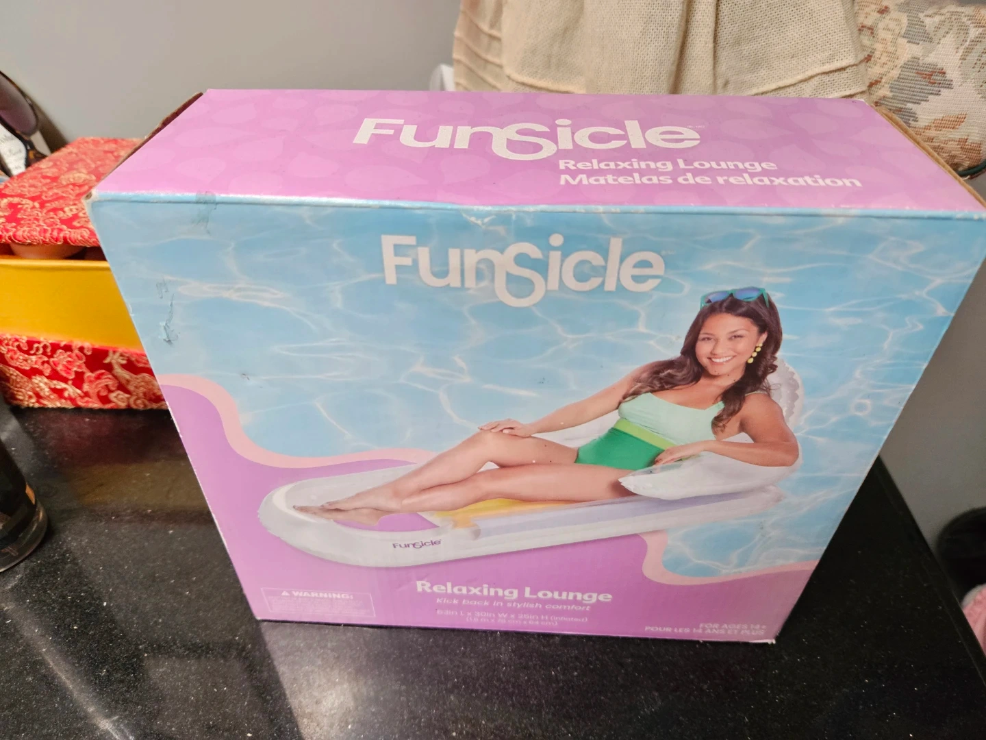 Selling a FunSicle relaxing lounge, still in its original box! It's perfect for kicking back in stylish comfort. The dimensions are 63 in x 30 in.