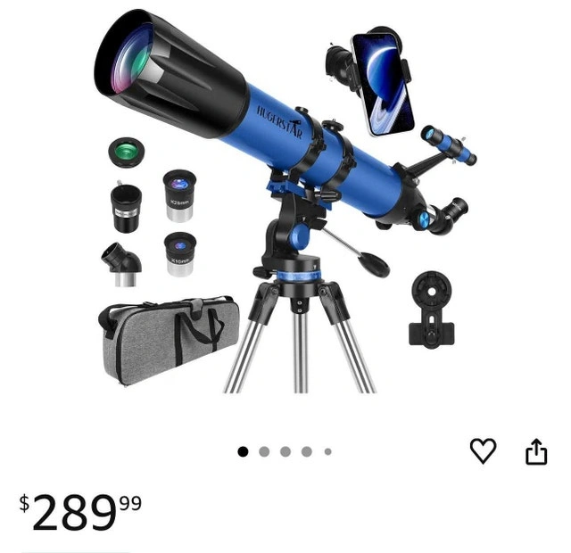 ⭐ Superior Optics (Clear & Bright Images) The HUGERSTAR 90/800 refractor telescope features a 90 mm large aperture and 800 mm focal length (f/8.89), delivering crisp, high-contrast views of the Moon, stars, planets, landscapes and more. Fully multi-coated glass maximizes light transmission for brighter, sharper images—ideal for both beginners and hobby astronomers.