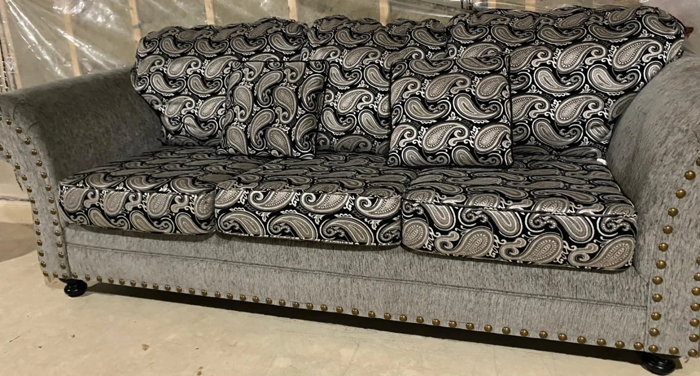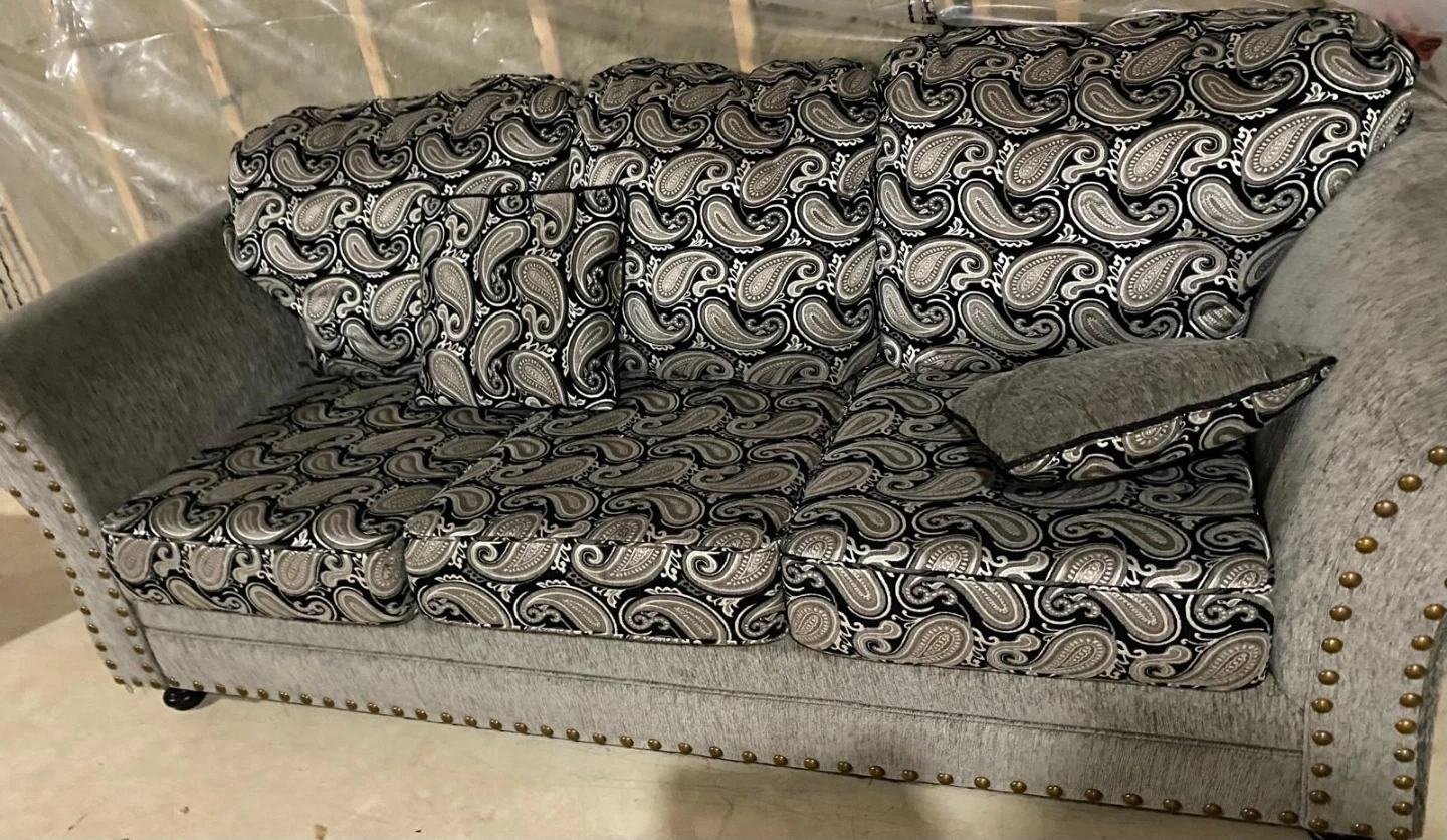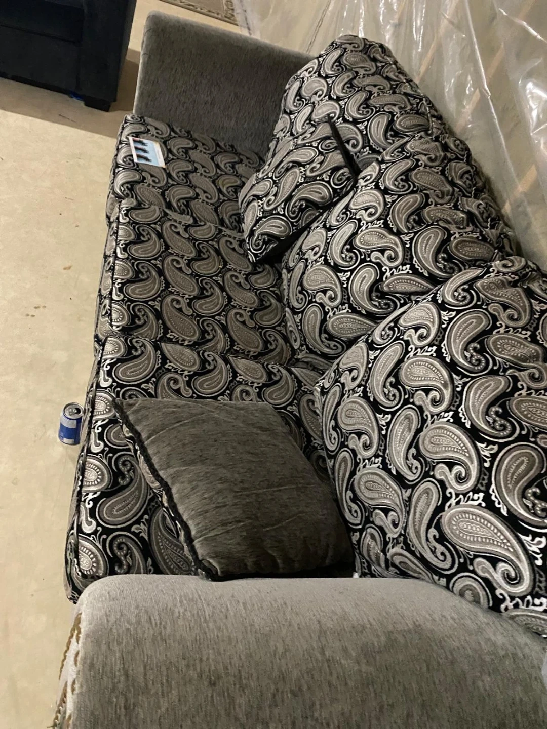 Selling a comfortable sofa with a unique paisley-like pattern in grey, black, and white. It comes with matching cushions for extra coziness. The sofa is in good condition and would be a great addition to any living room! One sitting cusion is missing you can use plain black
