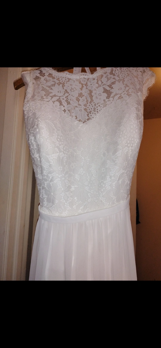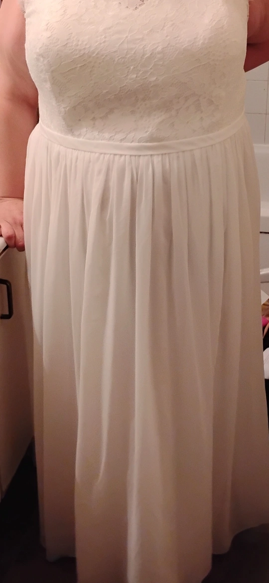 Selling a beautiful white Azazie bridesmaid dress! It features a delicate lace bodice and a flowy chiffon skirt. It's in great condition and perfect for a wedding or special occasion. The dress is too big on myself (sz20) unsure of exact size but thinking it would fit 22-26....I lost weight and do not want to do any alterations anymore. Sadly just hanging in a closet
