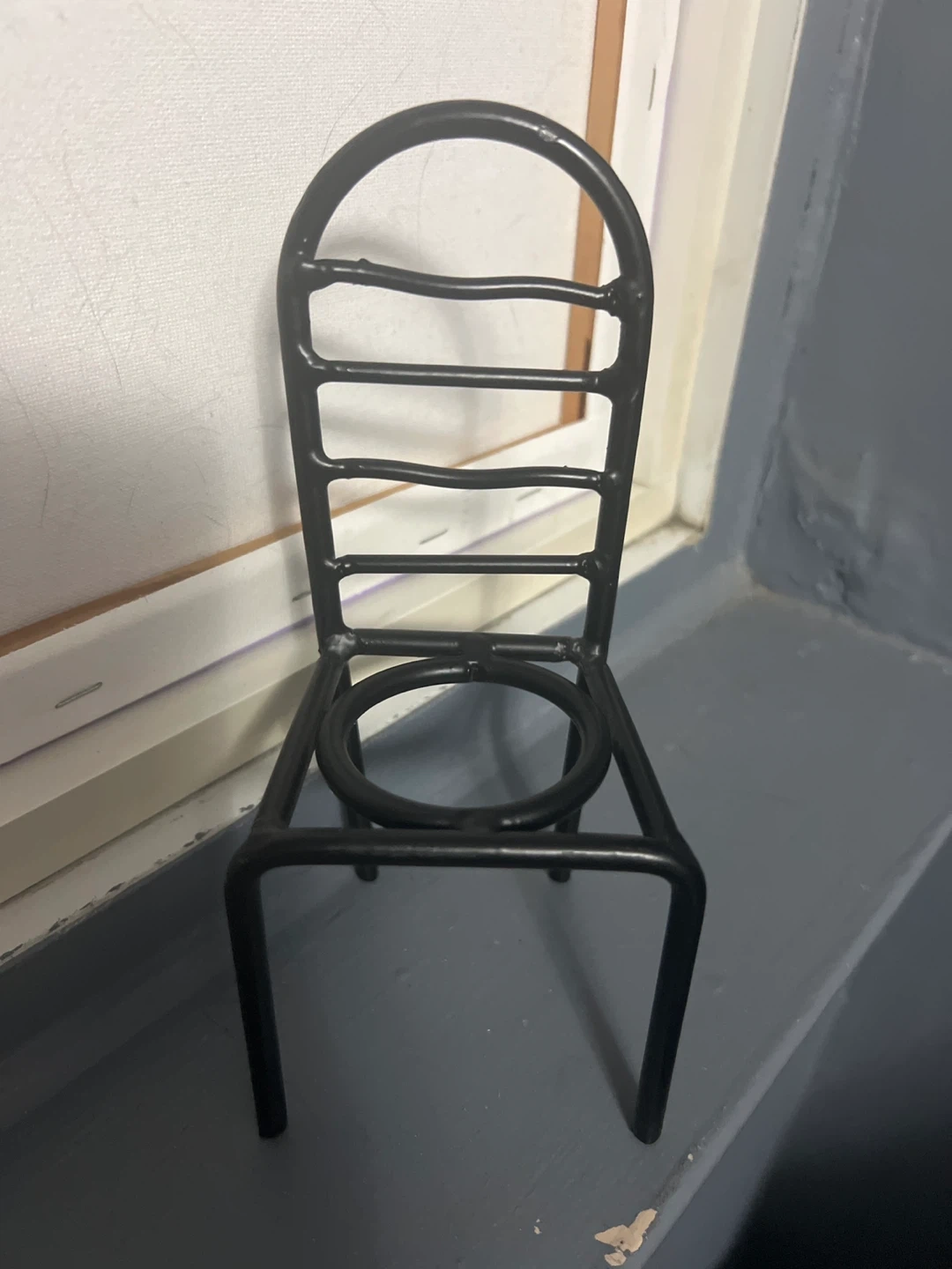 This is a cute little black metal egg holder shaped like a chair! It's in great condition and would make a fun addition to your kitchen decor