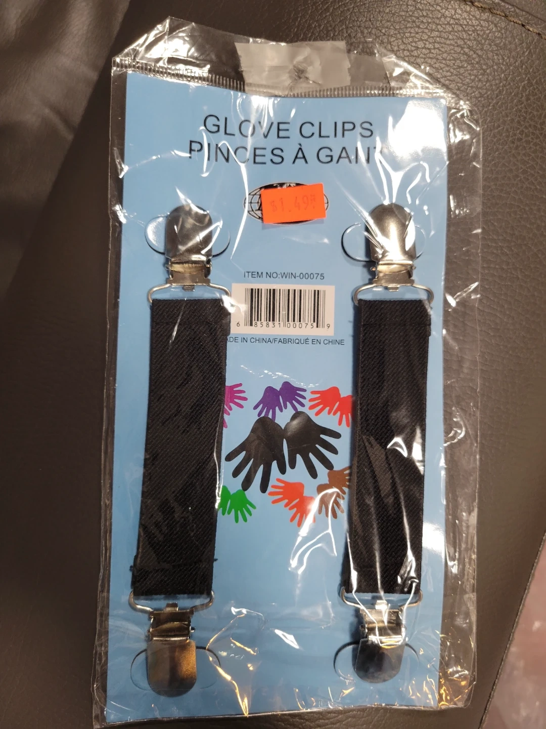 Brand new glove clips, still in the original packaging! These handy clips will keep your gloves together and prevent them from getting lost. Originally priced at $1.49.