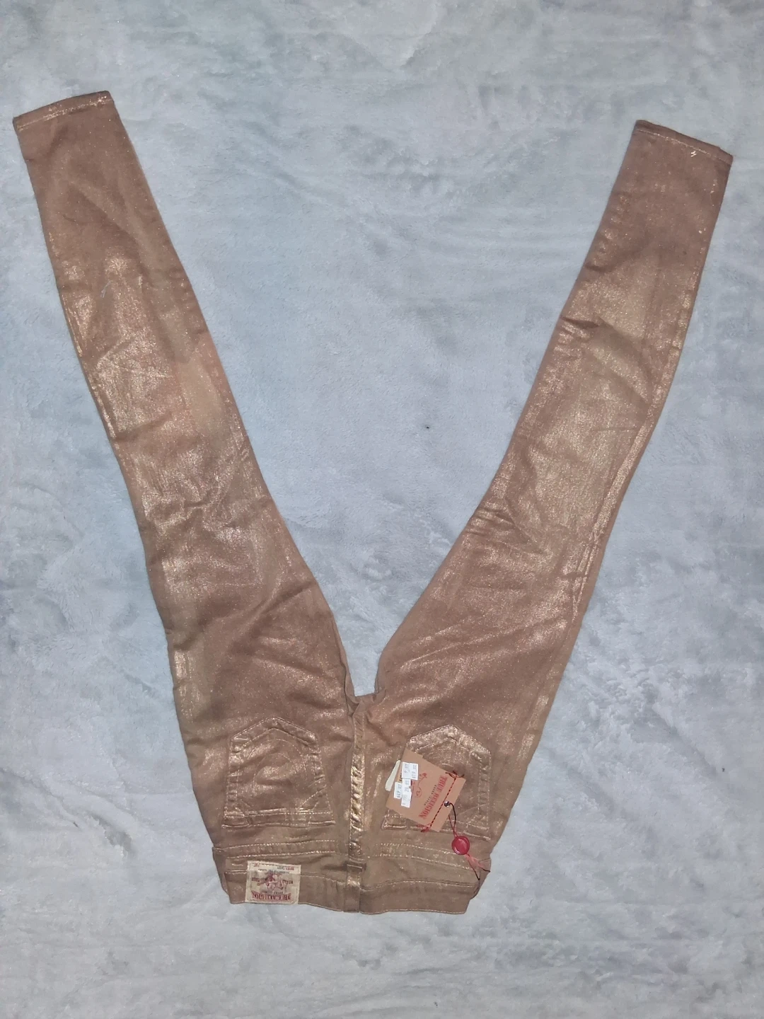 Selling a pair of True Religion jeans in a metallic gold colour. They're a size 24 but they're stretchy, brand new perfect for adding a bit of sparkle to your wardrobe
