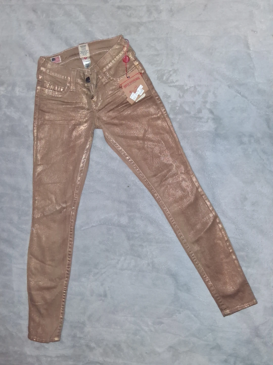 Selling a pair of True Religion jeans in a metallic gold colour. They're a size 24 but they're stretchy, brand new perfect for adding a bit of sparkle to your wardrobe