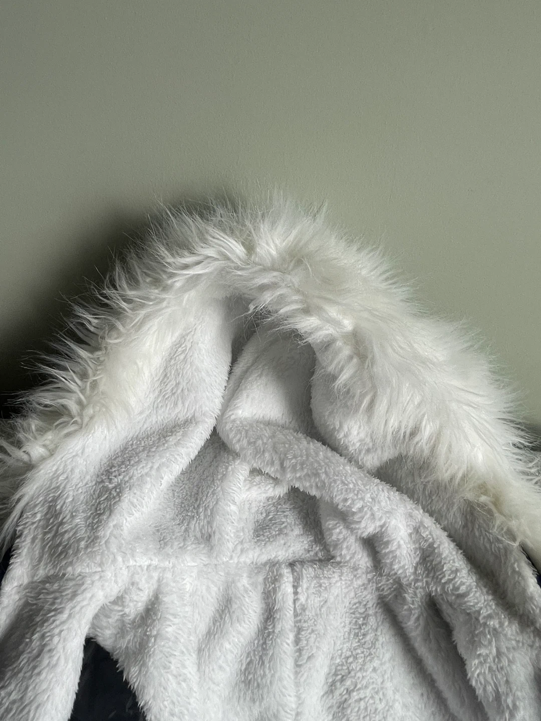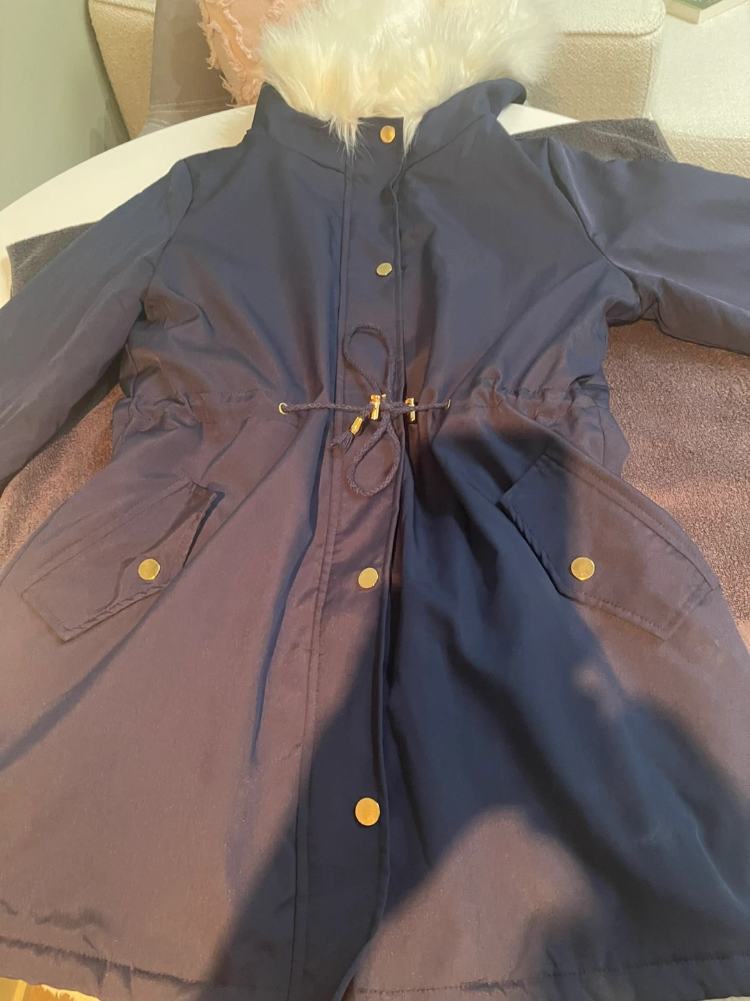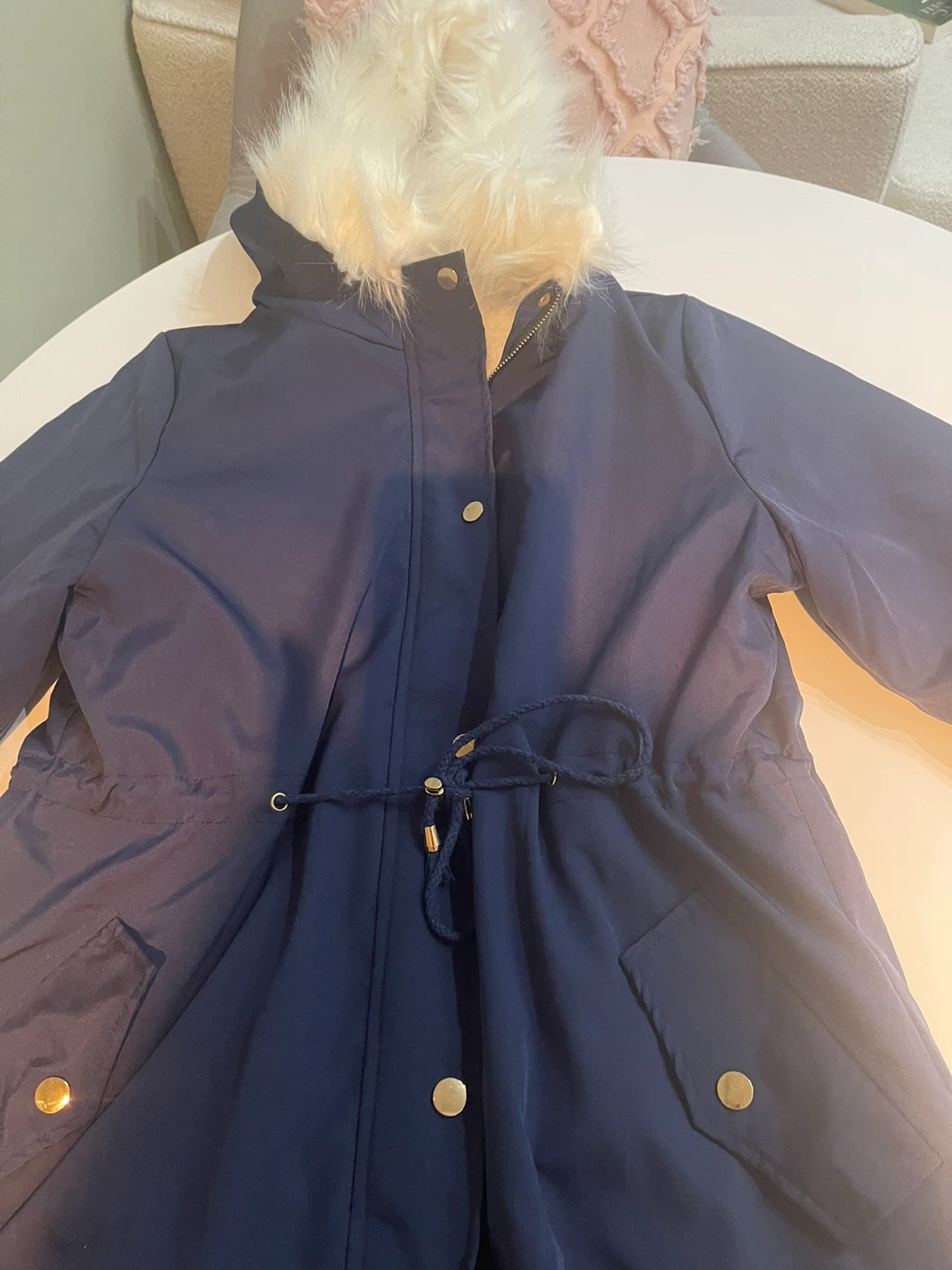 Cozy navy blue winter parka, perfect for those chilly Canadian days! It features a soft, faux fur-lined hood to keep you extra warm. The parka has a drawstring waist for a flattering fit and handy pockets for your essentials. The inside is lined with a soft white material.