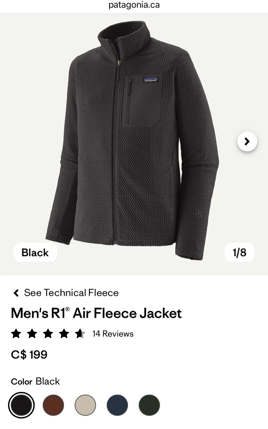 Selling a Patagonia Men's R1 Air Fleece Jacket in black(Large)It's brand new as a gift from Frd. Originally bought for $199.