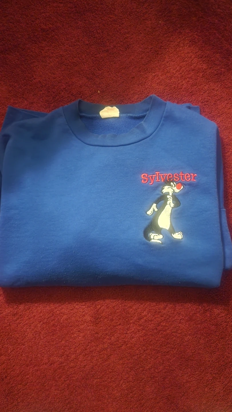 Selling a blue sweatshirt with Sylvester the Cat embroidered on it! It's in great condition and perfect for any Looney Tunes fan
