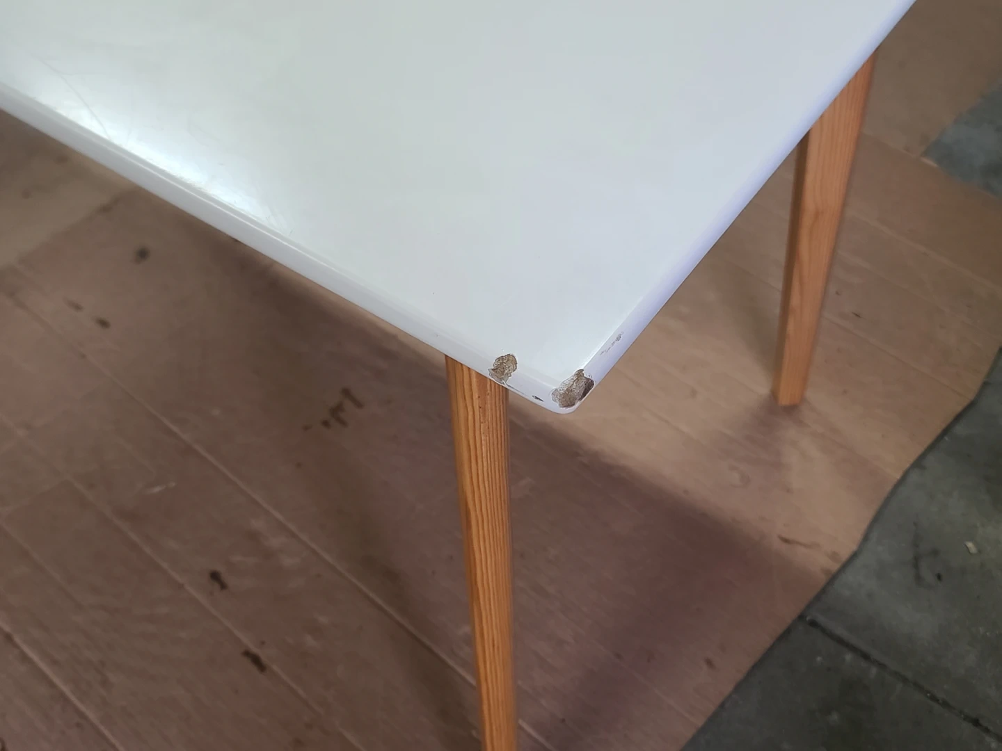 Beautiful table with a white top and light wood legs. It's in used condition, as you can see some wear and tear on the corners of the tabletop. Still a sturdy and functional piece of furniture! Delivery can be arranged. Viewing and pickup by appointment