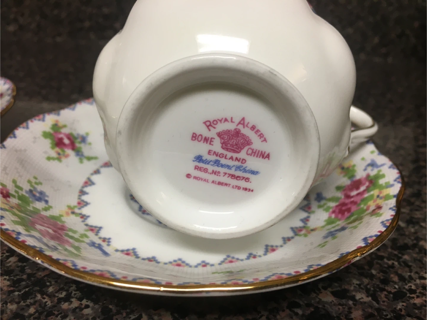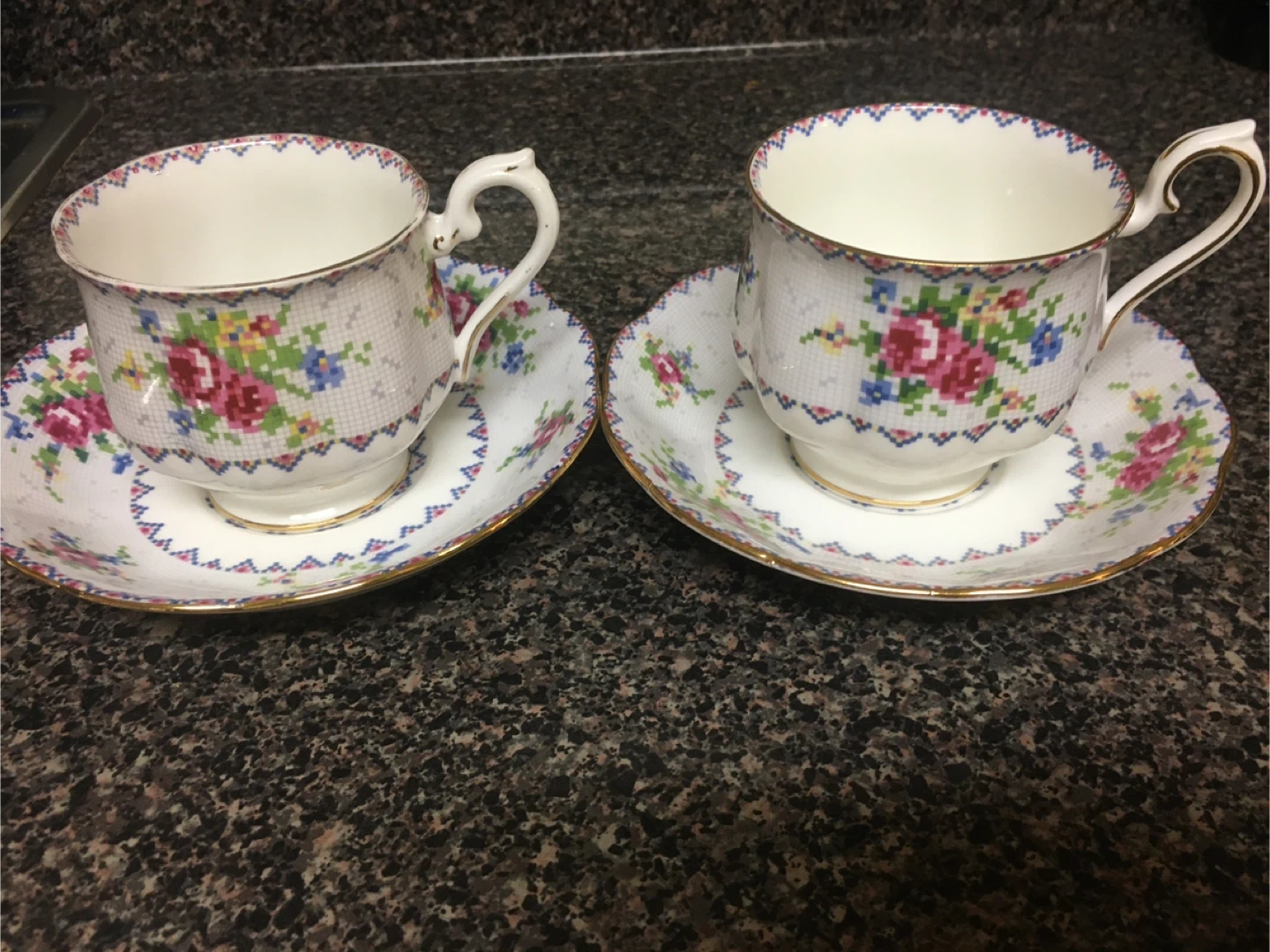 Two Royal Albert Bone China tea cups and saucers in the Petit Point pattern! They are in great condition and feature a beautiful floral design with gold trim.