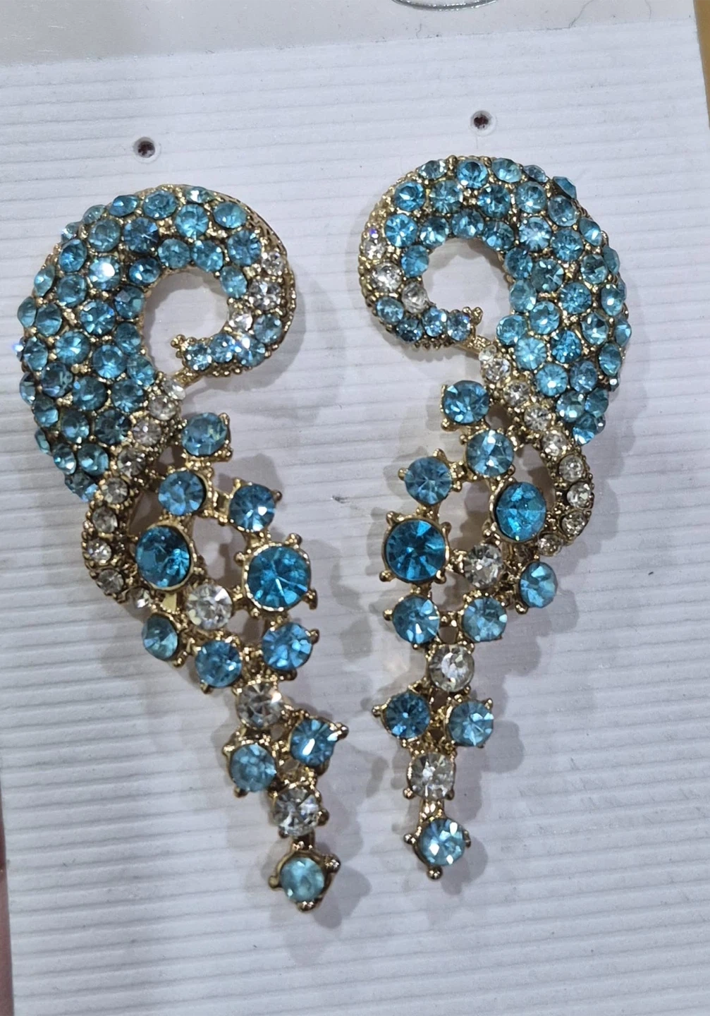 These are some beautiful statement earrings with a gold-tone finish and blue and clear rhinestones! They're perfect for dressing up any outfit and adding a touch of sparkle ✨