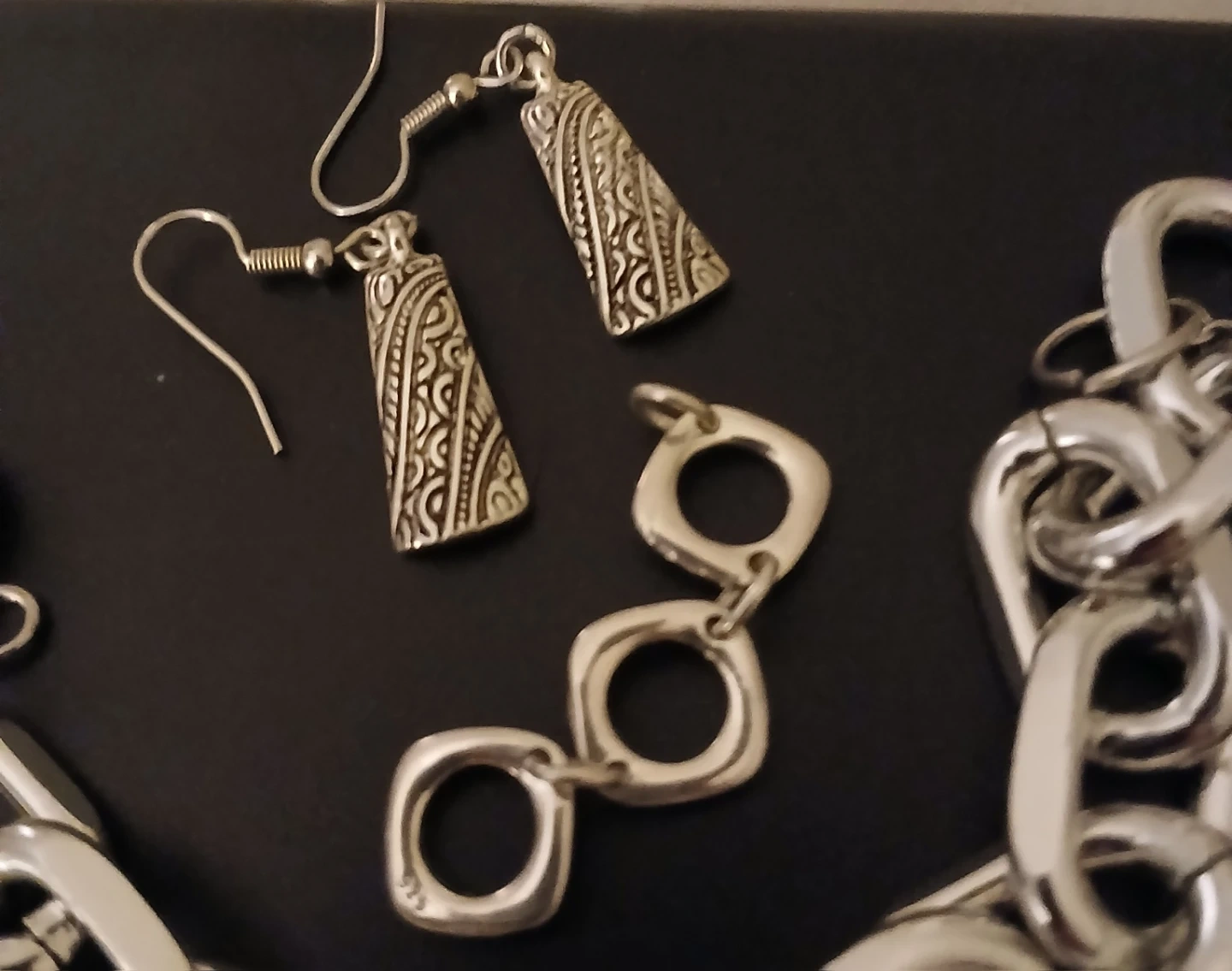 Selling a jewelry set that includes a bracelet and earrings. The bracelet has a chunky chain design with a coin charm. The earrings are drop style with an intricate pattern. Both pieces are a silver tone.